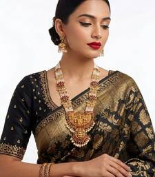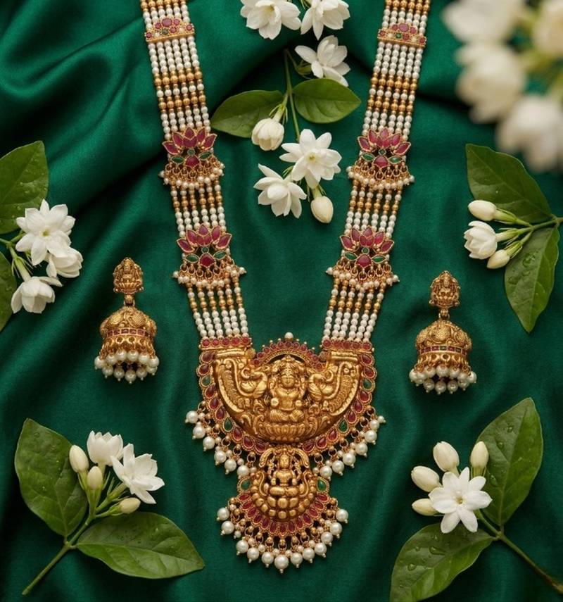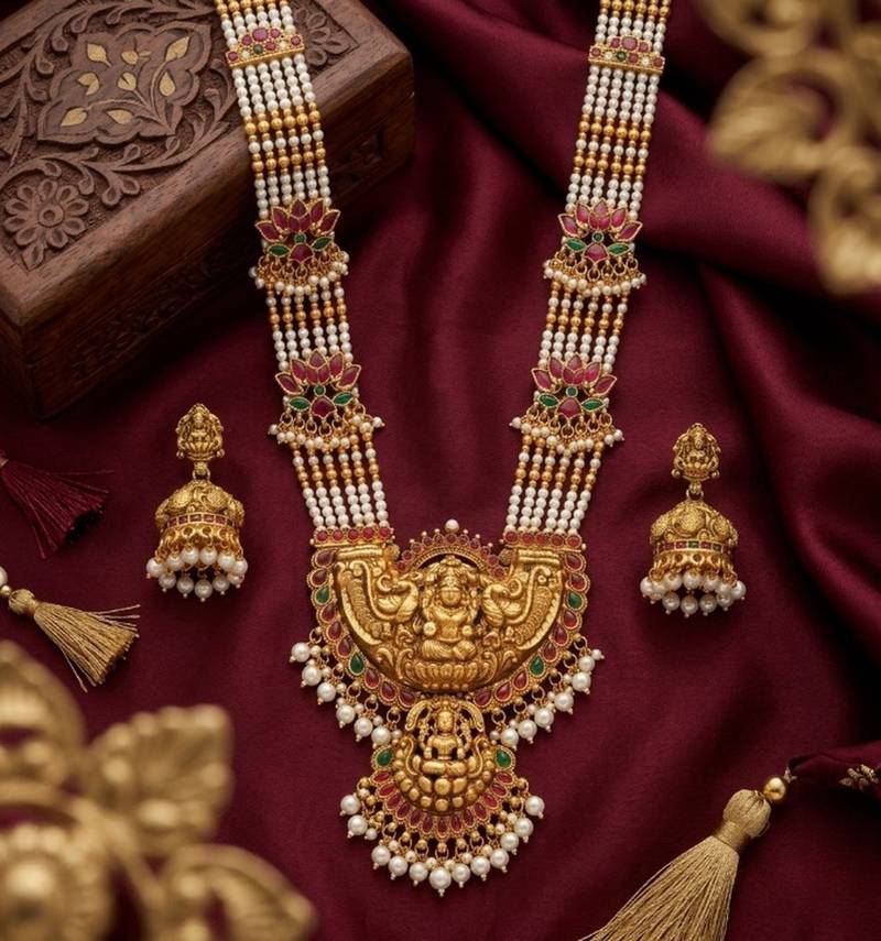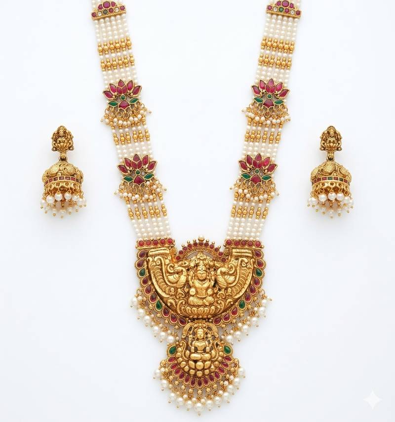 | Product Name | Exquisite Temple Jewelry: Handcrafted Gold Plated Long Pearl Necklace / Set With Goddess Pendant & Jhumkas | |