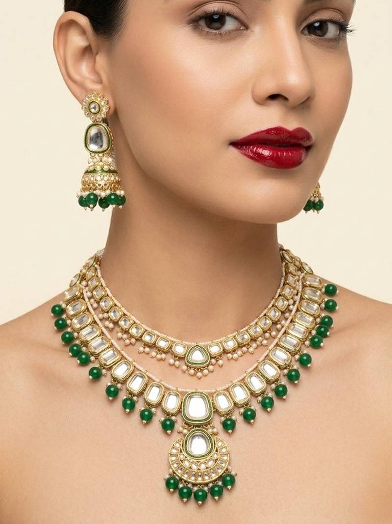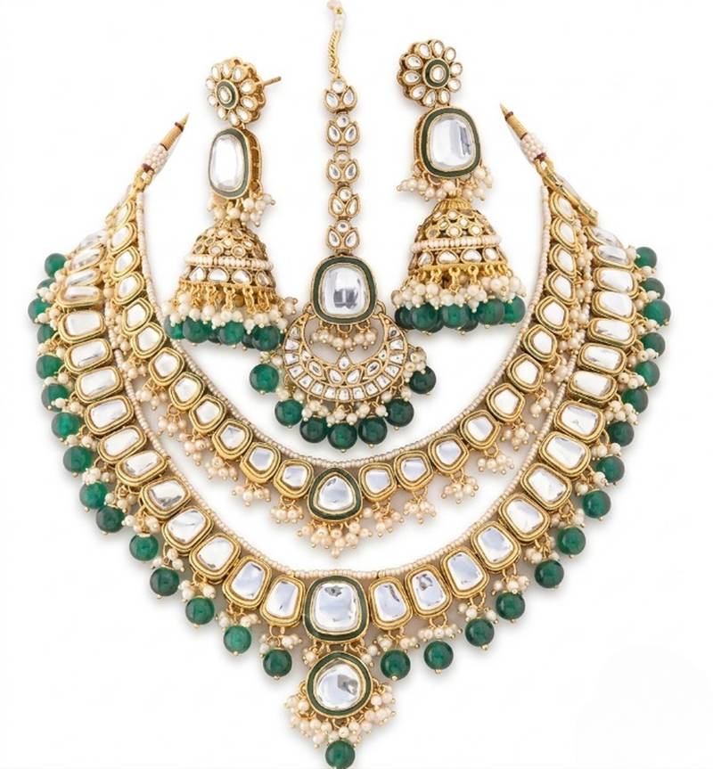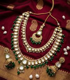 | Product Name | Grand Kundan & Emerald Green Bead Necklace / Set With Jhumka Earrings & Maang Tikka | |