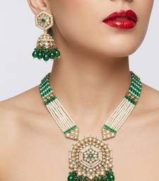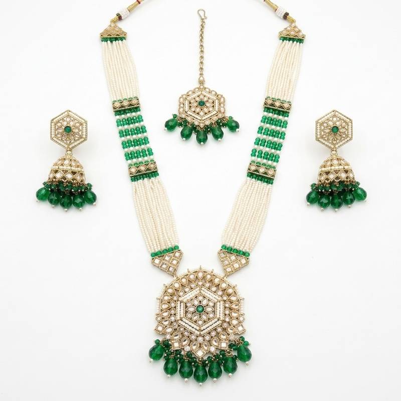 | Product Name | Long Pearl Mala Golden Rainbow Diamond Studded Jumkee Tikka Necklace / Set | |