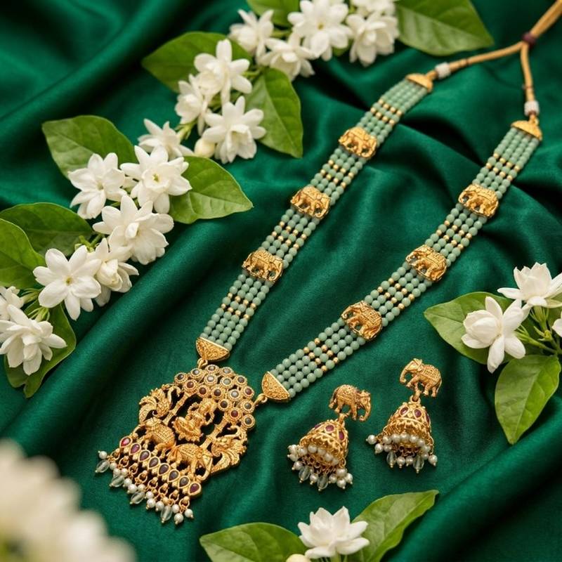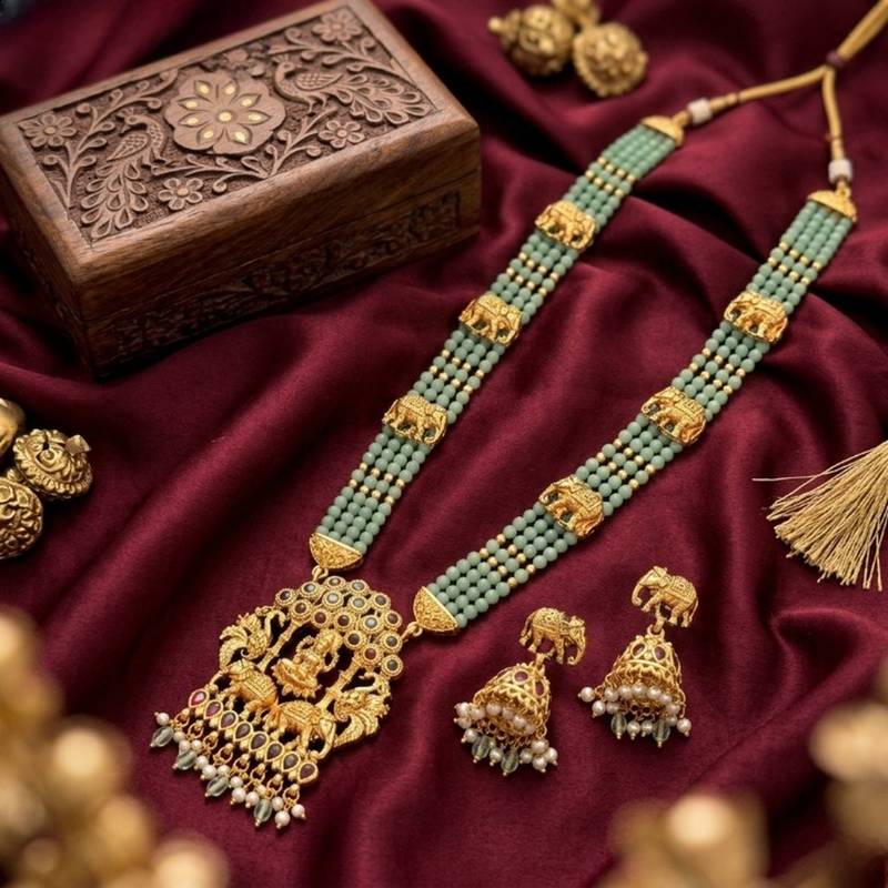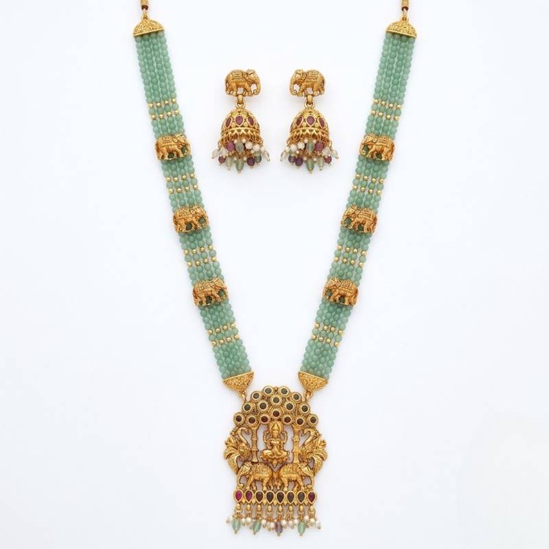 | Product Name | Traditional Gold Plated Temple Jewelry Set Handcrafted Elephant Motif Green Bead Long Necklace / & Jhumka Earrings | |