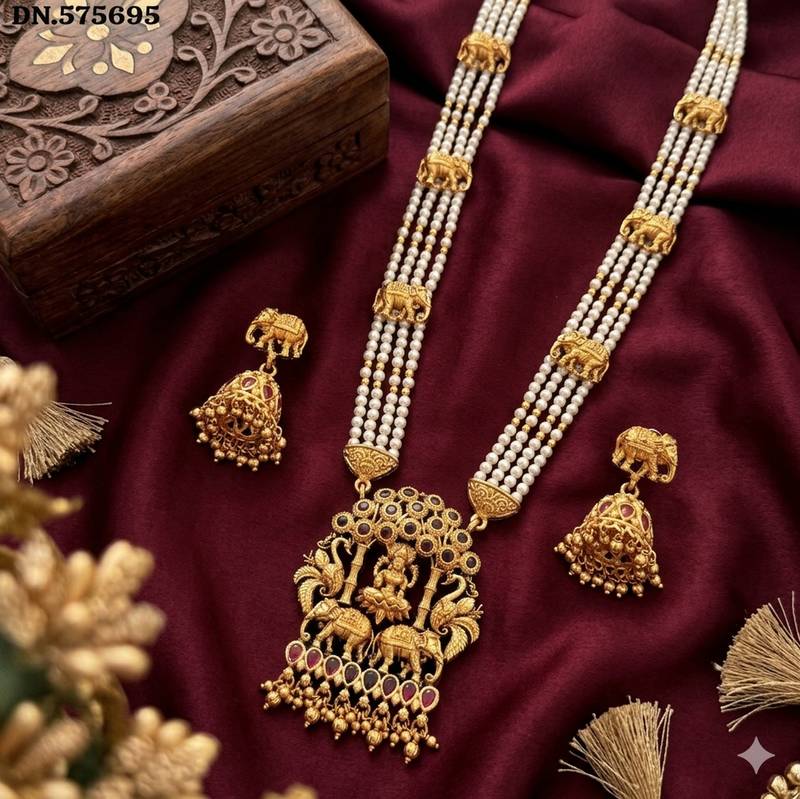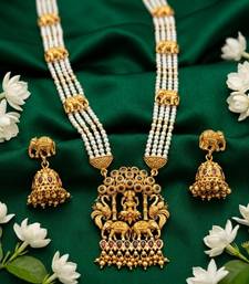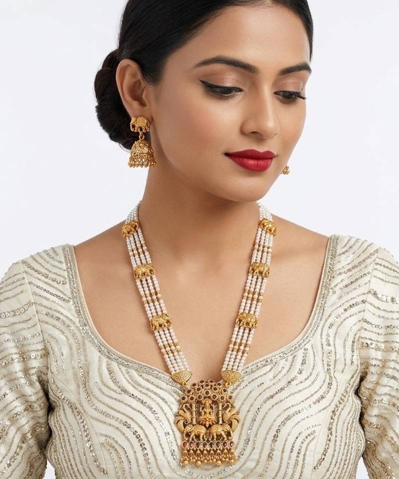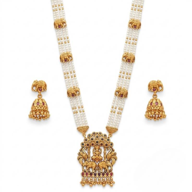 | Product Name | Traditional Gold Plated Temple Jewelry Set Handcrafted Elephant Motif Green Bead Long Necklace / & Jhumka Earrings | |