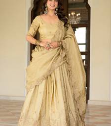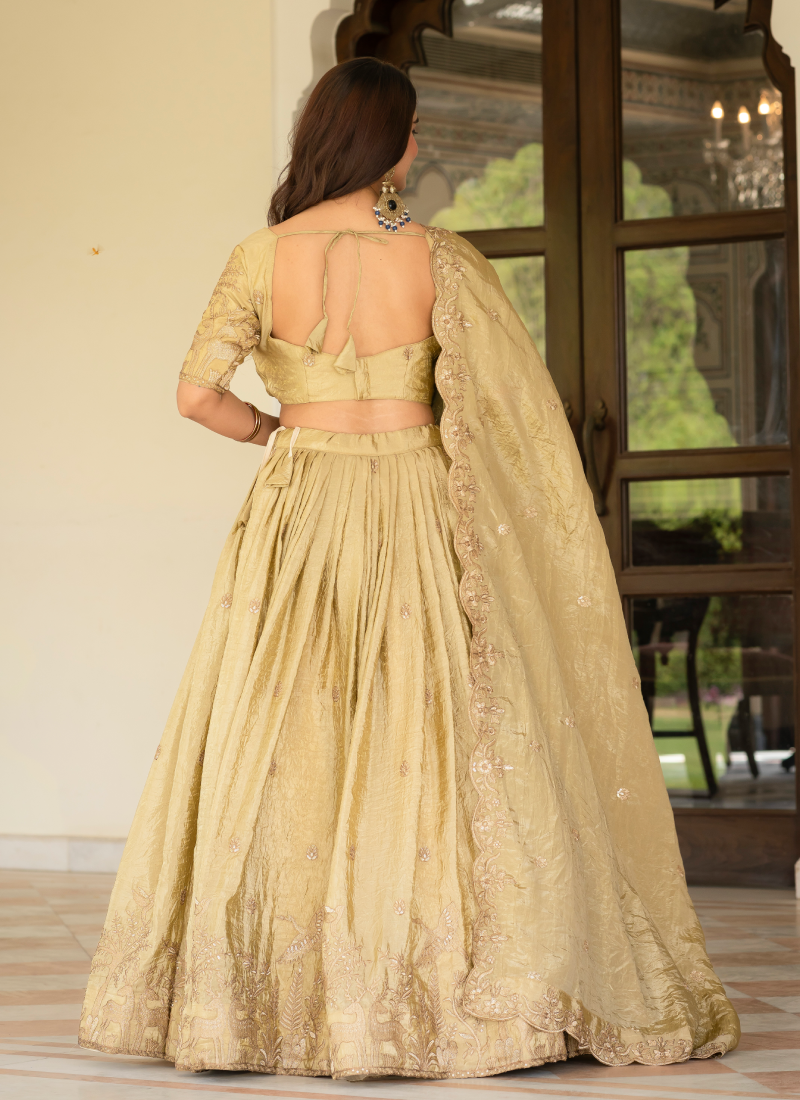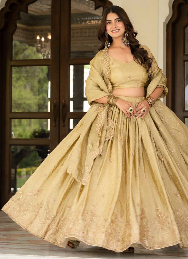 Cream zari sequence embroidery work gold crush silk semi stiched lehenga choli