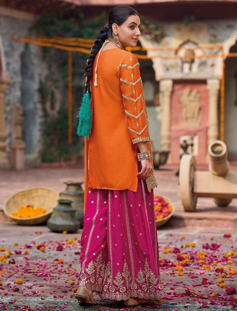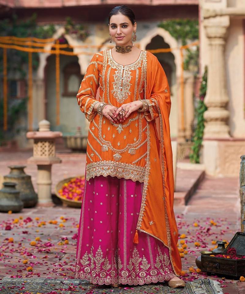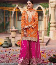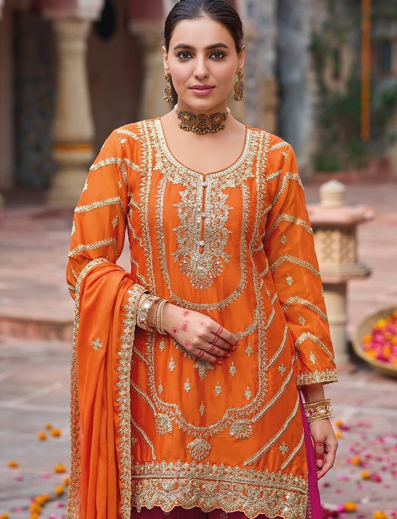 | Product Name | Orange Embroidered Chinon Free Size Stitched Palazzo Style Salwar Suit | |