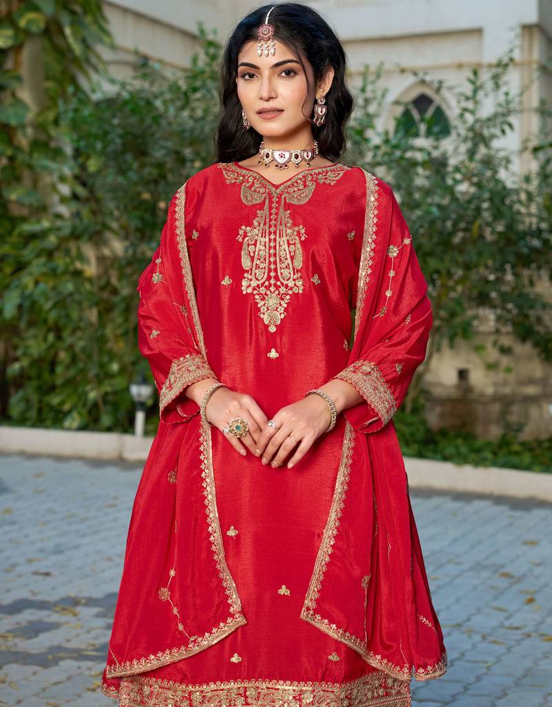 | Product Name | Red Embroidered Chinon Free Size Stitched Palazzo Style Salwar Suit | |