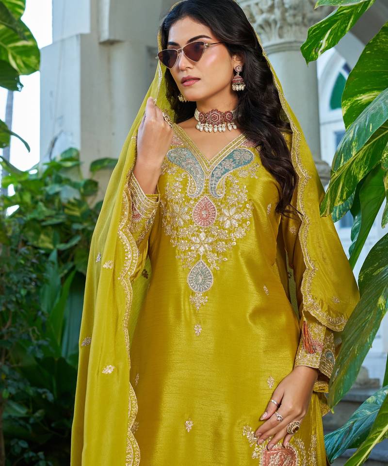 Yellow embroidered chinon free size stitched palazzo style salwar suit semi stitched