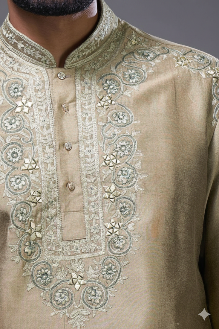Brown silk straight embroidery, mirror brown silk embroidery floral and mirror work kurta pant set