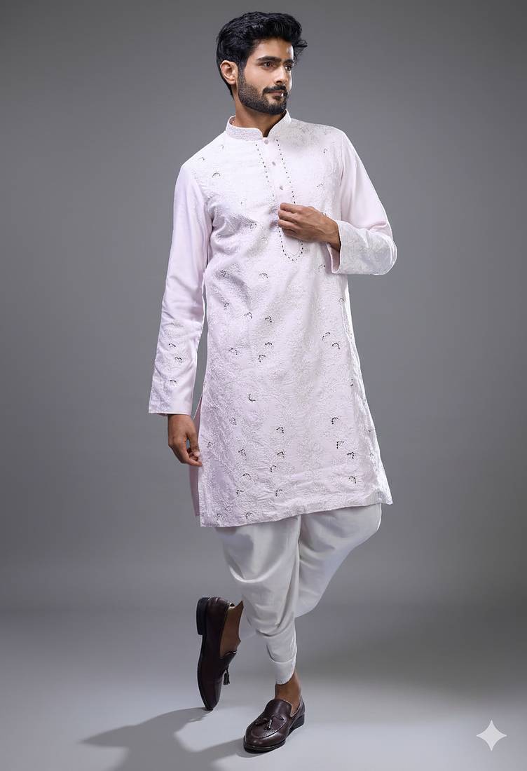 | Product Name | Powder Pink Silk Straight Embroidery, Mirror Pink Silk Embroidery, Mirrors Floral And Work Full Sleeve Kurta Set | |