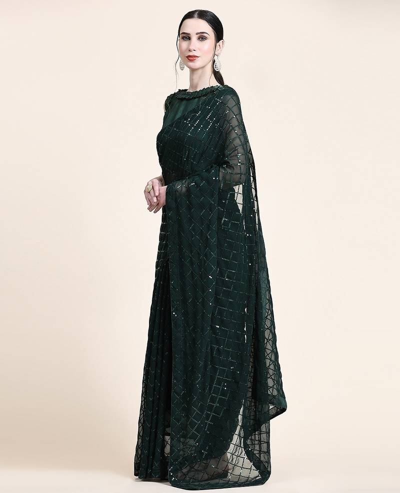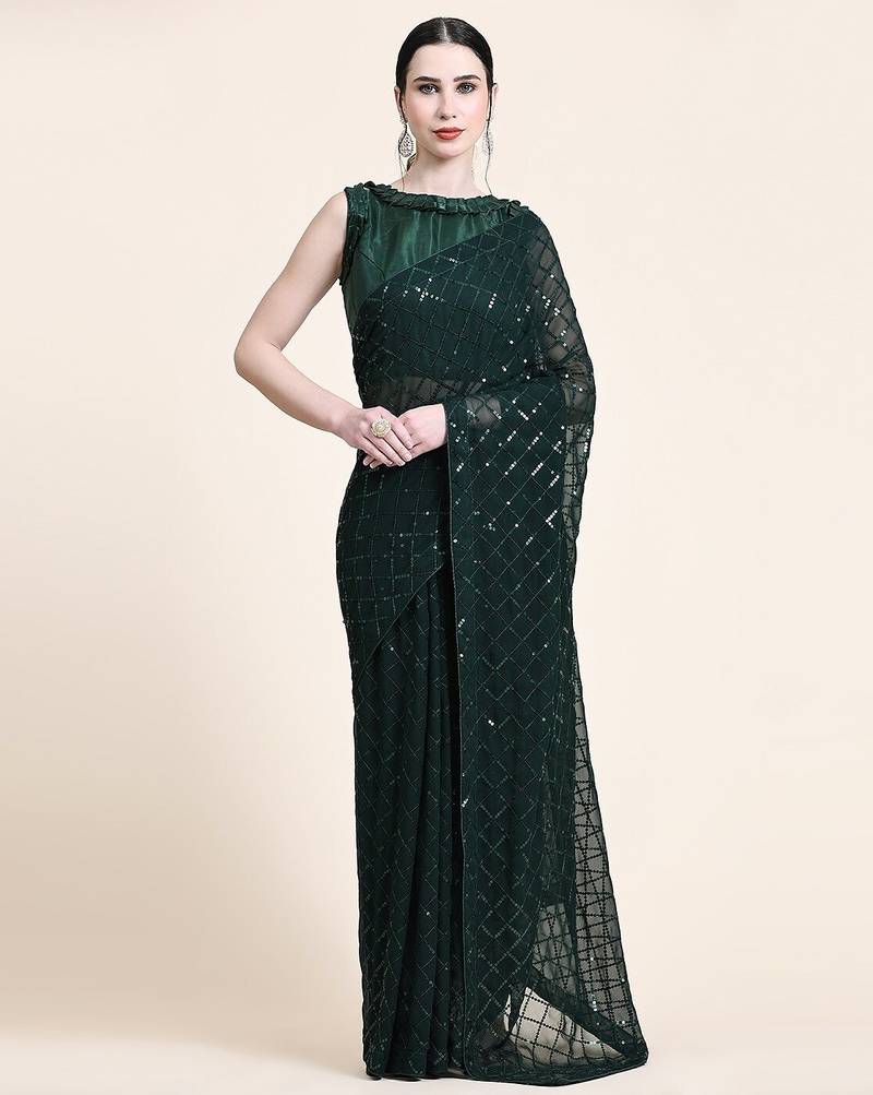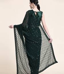 Women gorgette green zari lace work saree