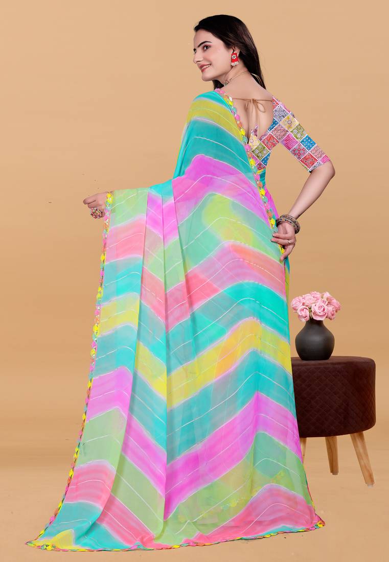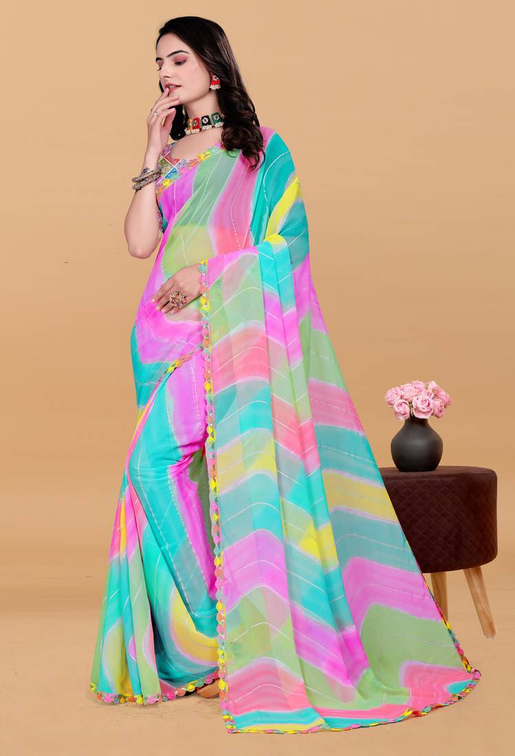 Women gorgette multi color zari lace work saree