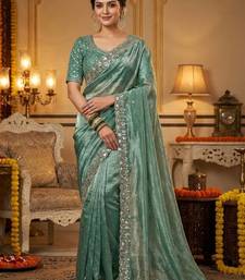 Women green embroidered fandy satin silk saree