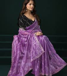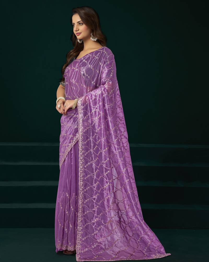 Women lavender embroidered net saree