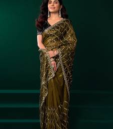 Women mehandi green embroidered net saree