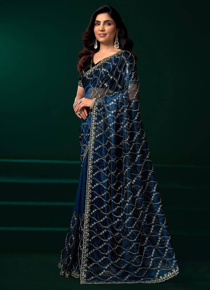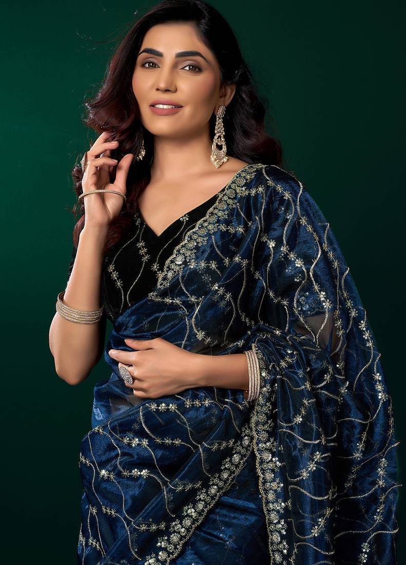 Women navy blue embroidered net saree