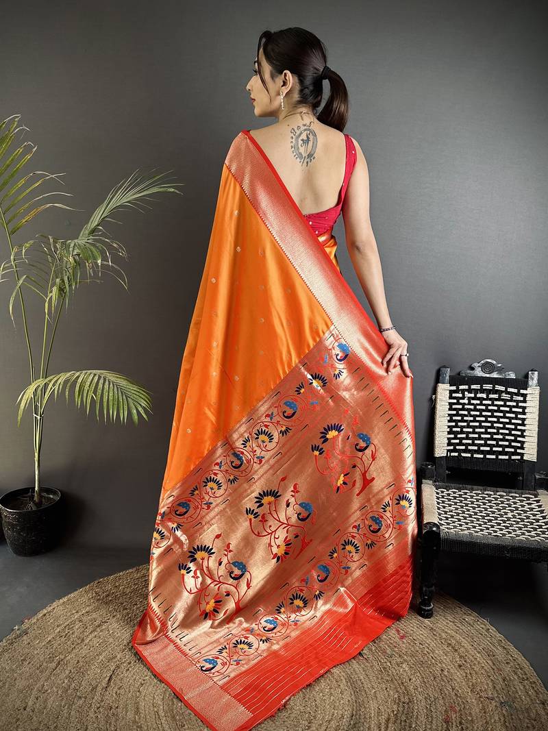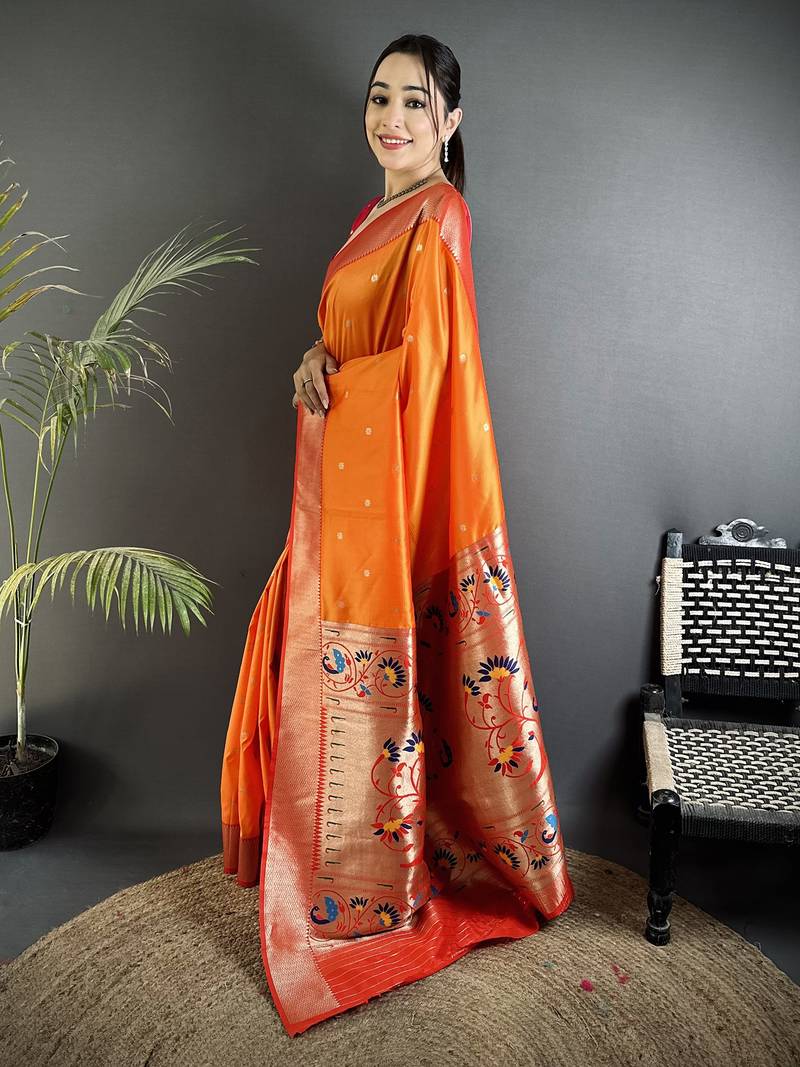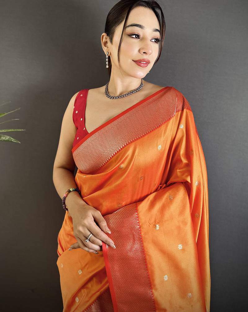 | Product Name | Women Orange Peacock Motifs Lichi Silk Saree | |