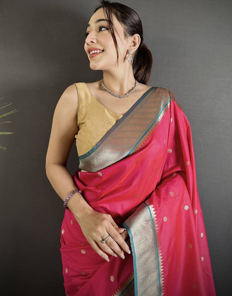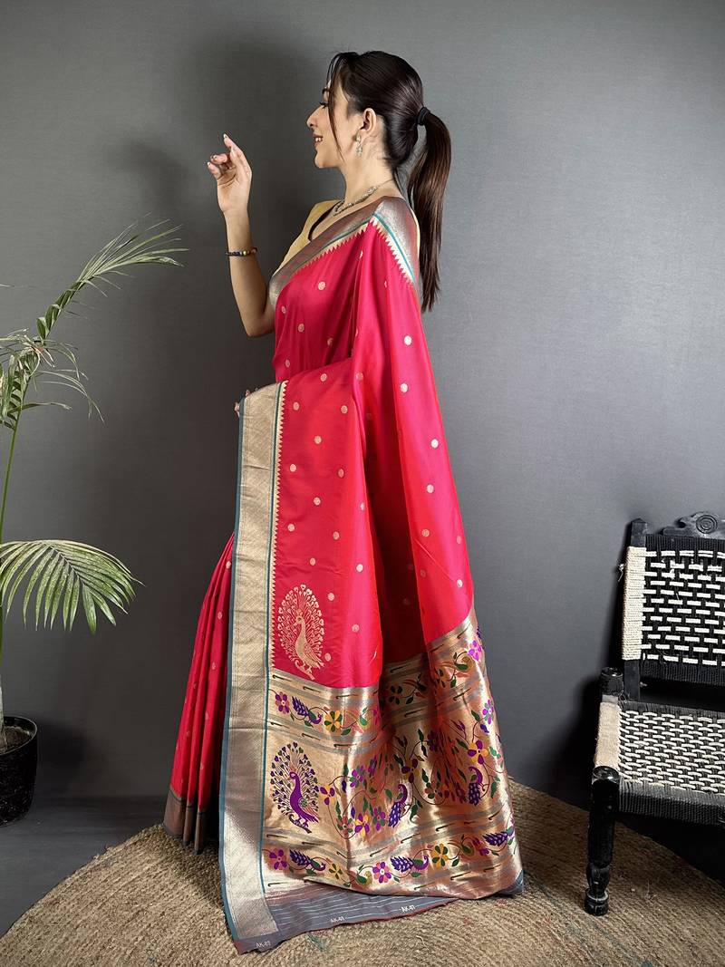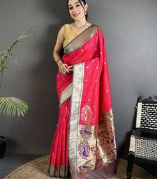 | Product Name | Women Pinkish Red Peacock Motifs Lichi Silk Saree | |