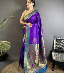 Women purple peacock&floral motifs lichi silk saree