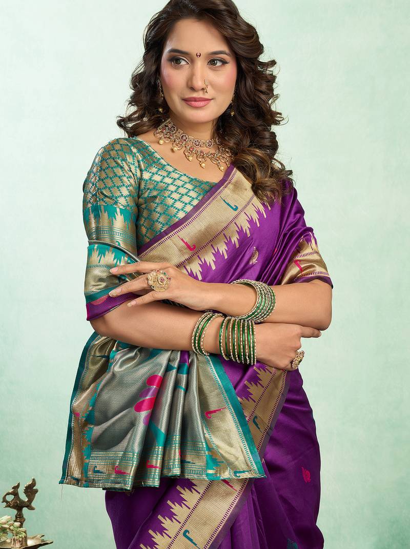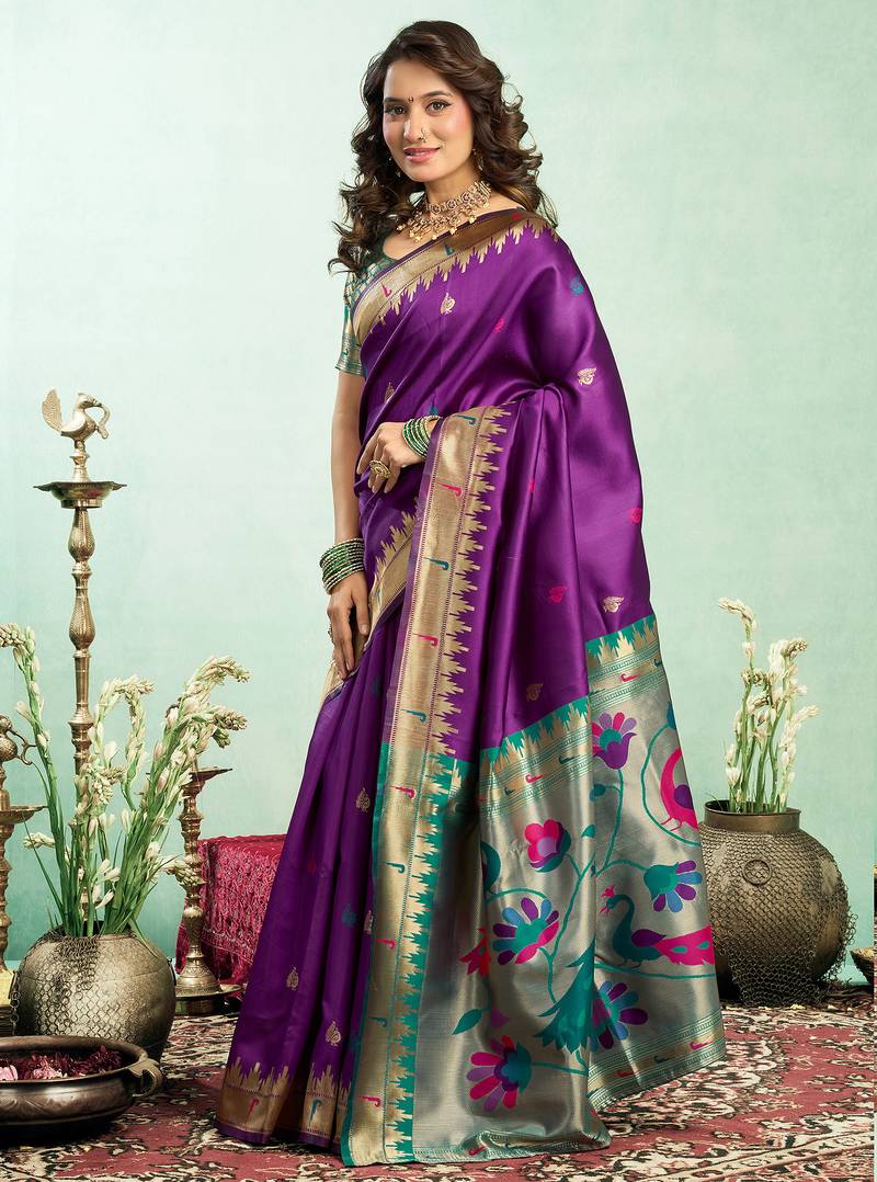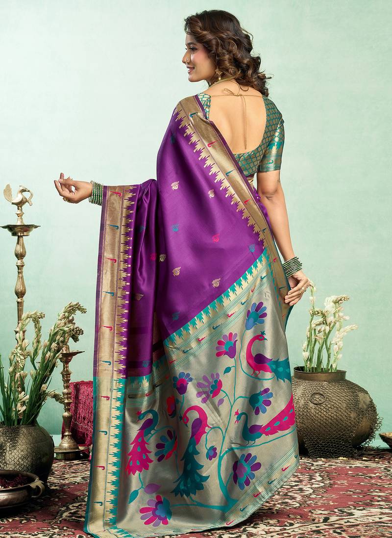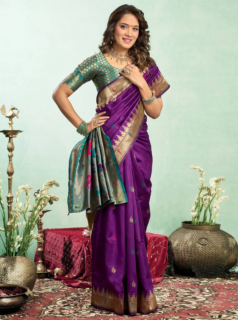 | Product Name | Women Purple Peacock Motifs Silk Blend Saree | |