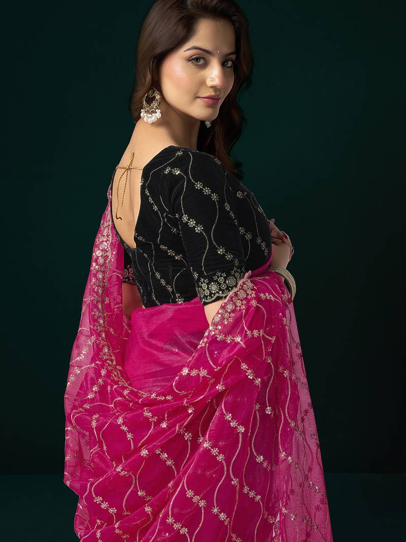 Women rani pink embroidered net saree