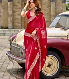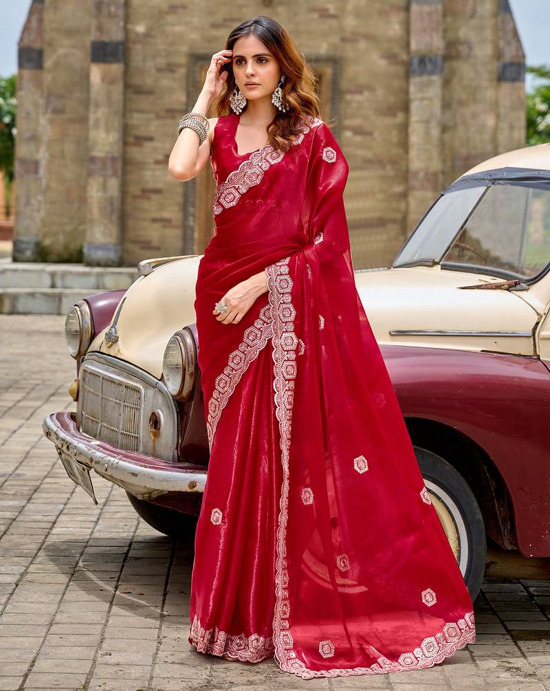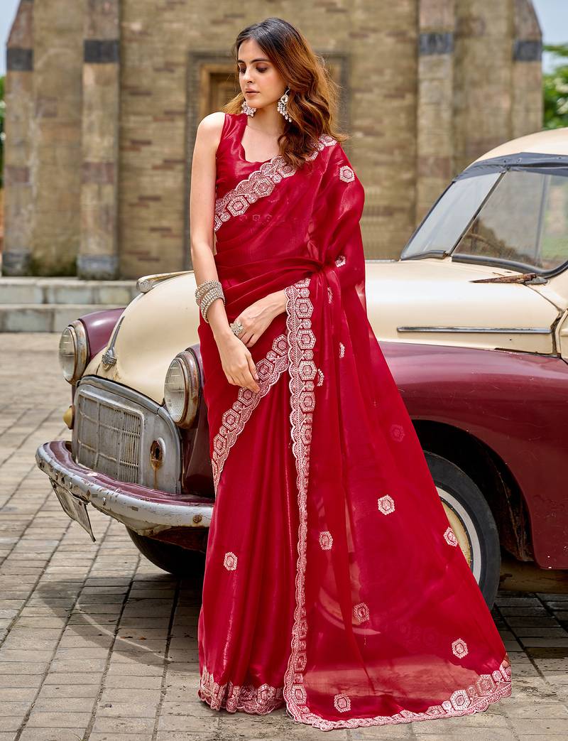 Women red geomatric shimmer chiffon saree