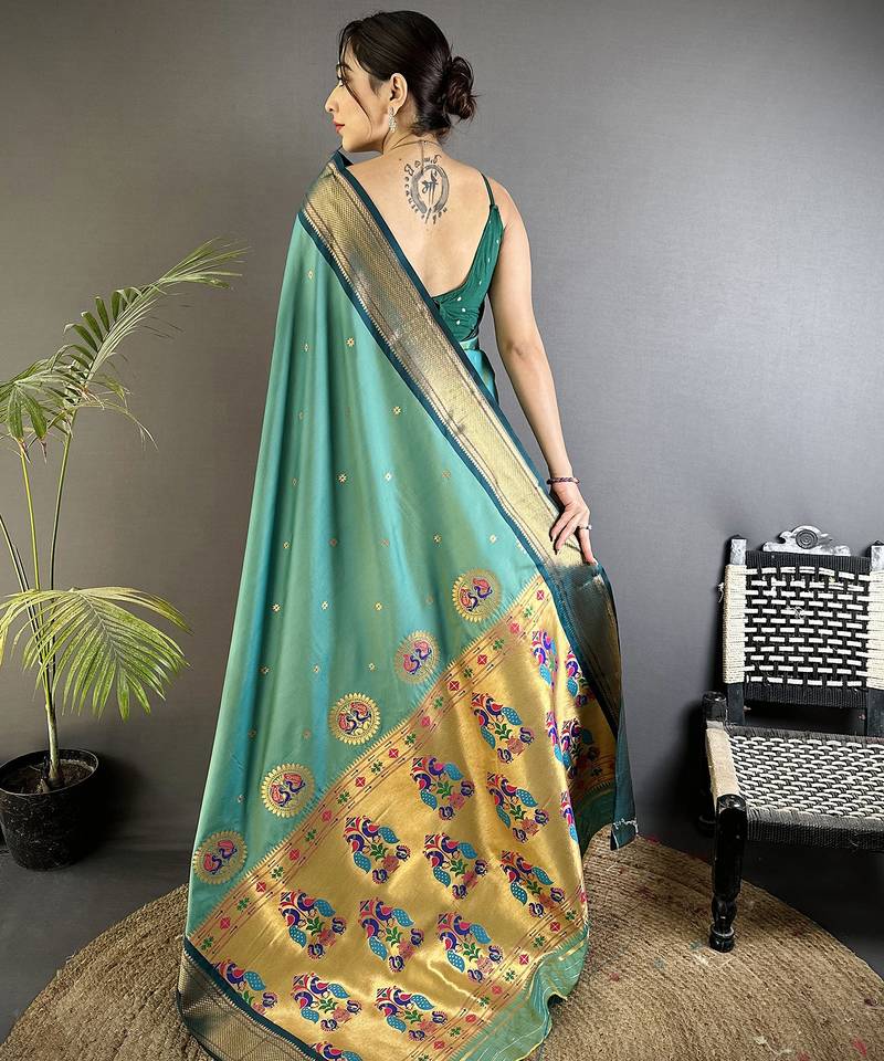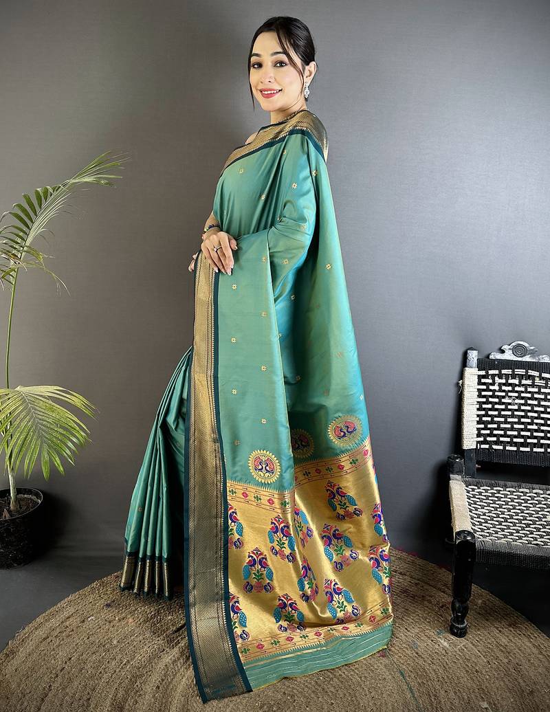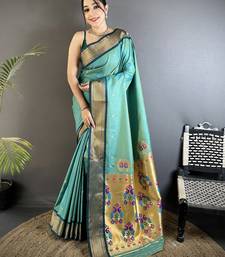 Women sea green peacock ethnic motifs lichi silk saree
