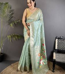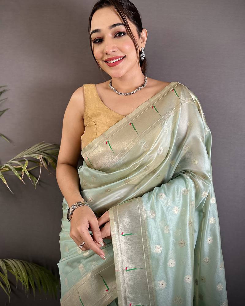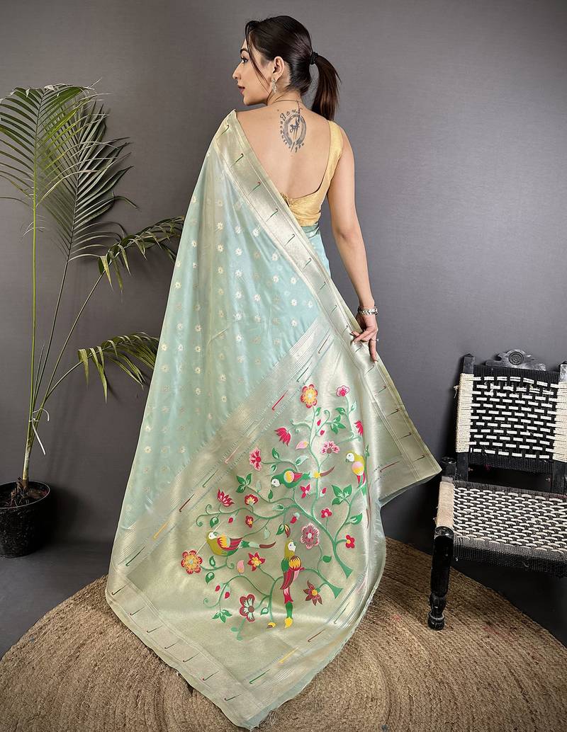 Women sky blue parrot & floral woven design tissue saree