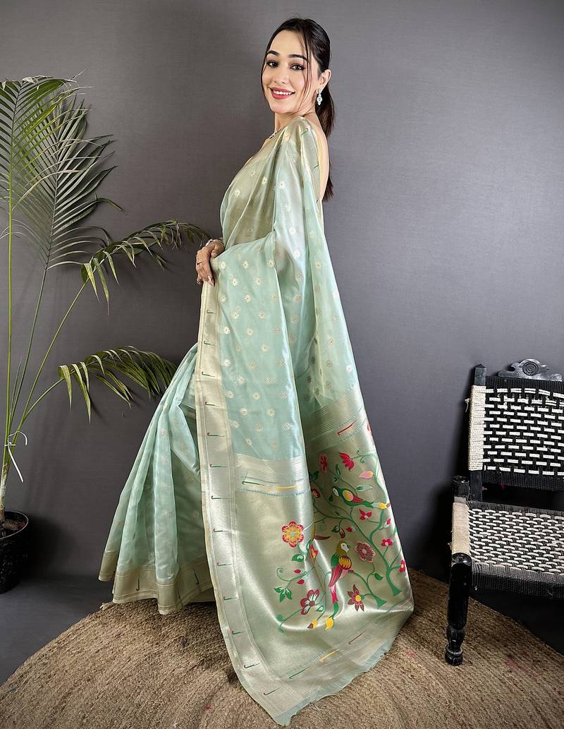 | Product Name | Women Sky Blue Parrot & Floral Woven Design Tissue Saree | |