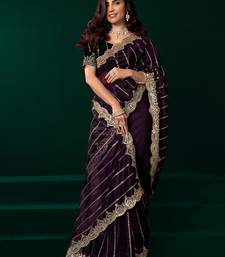 Women wine embroidered net saree