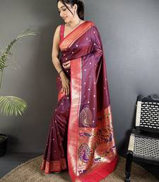 Women wine peacock motifs lichi silk saree