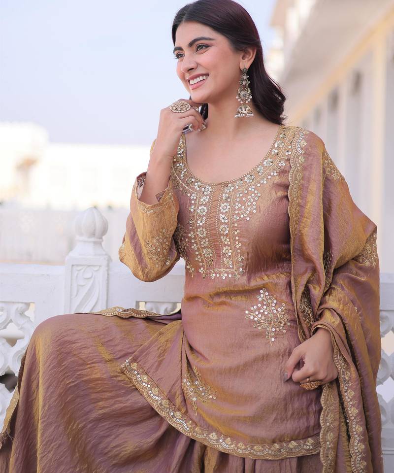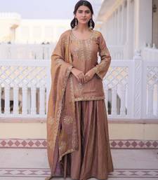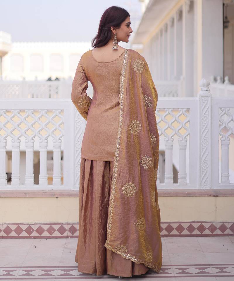 Brown fendi crush embroidered sharara set with dupatta stitched