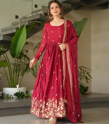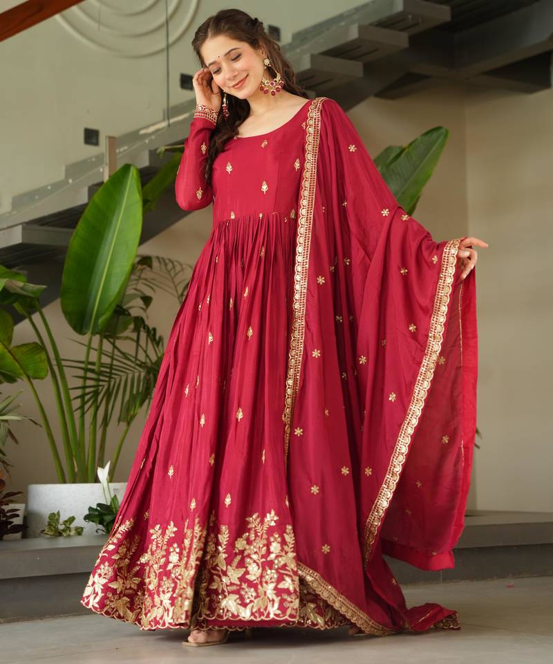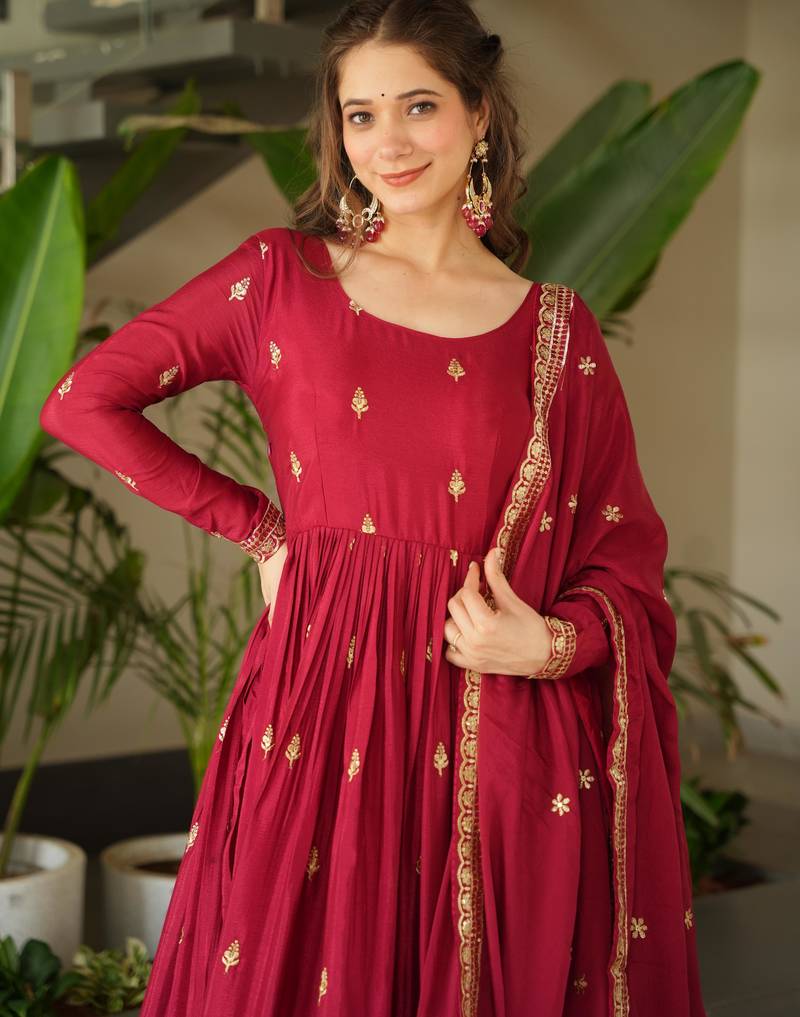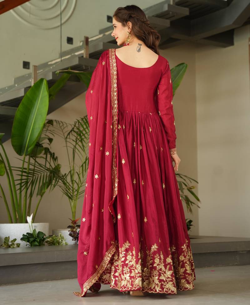 Maroon chinon embroidered anarkali set with dupatta stitched