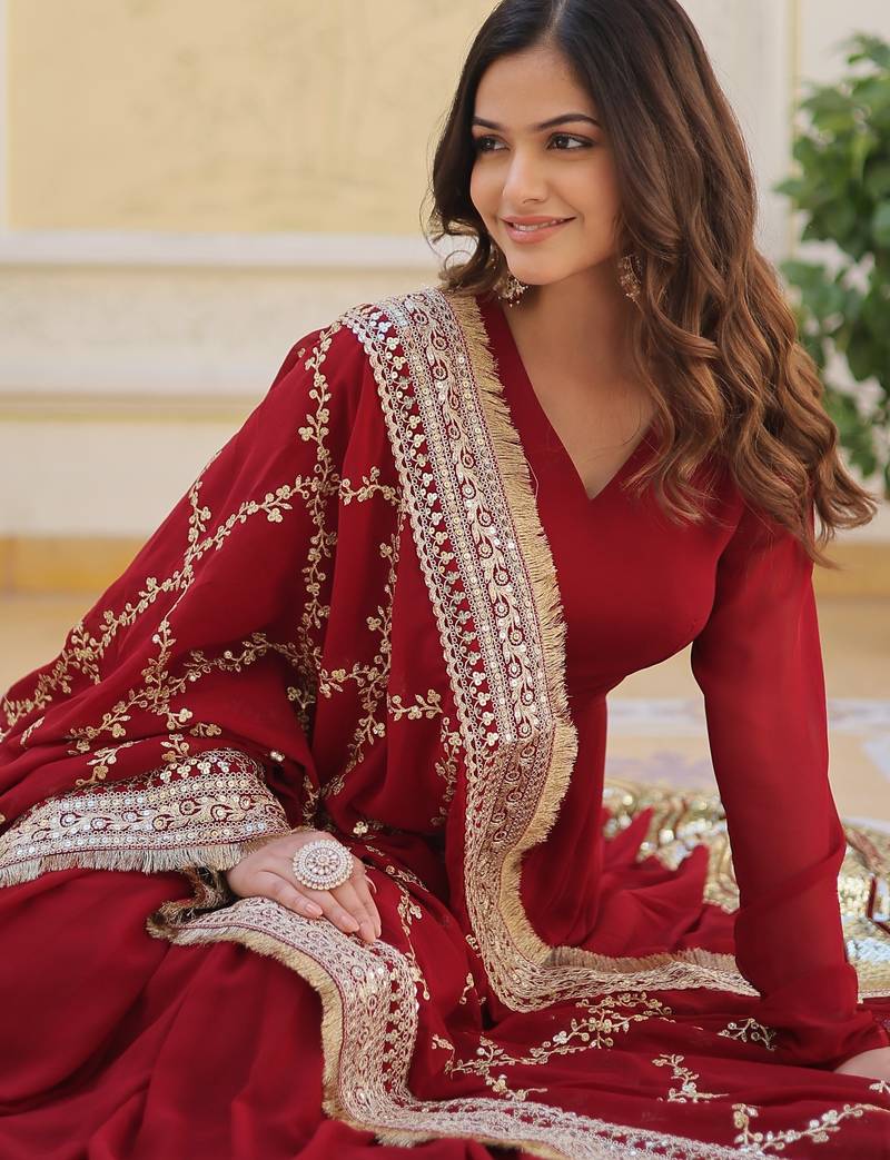 | • | Dupatta | : | Color- Maroon / Fabric- Faux Georgette |