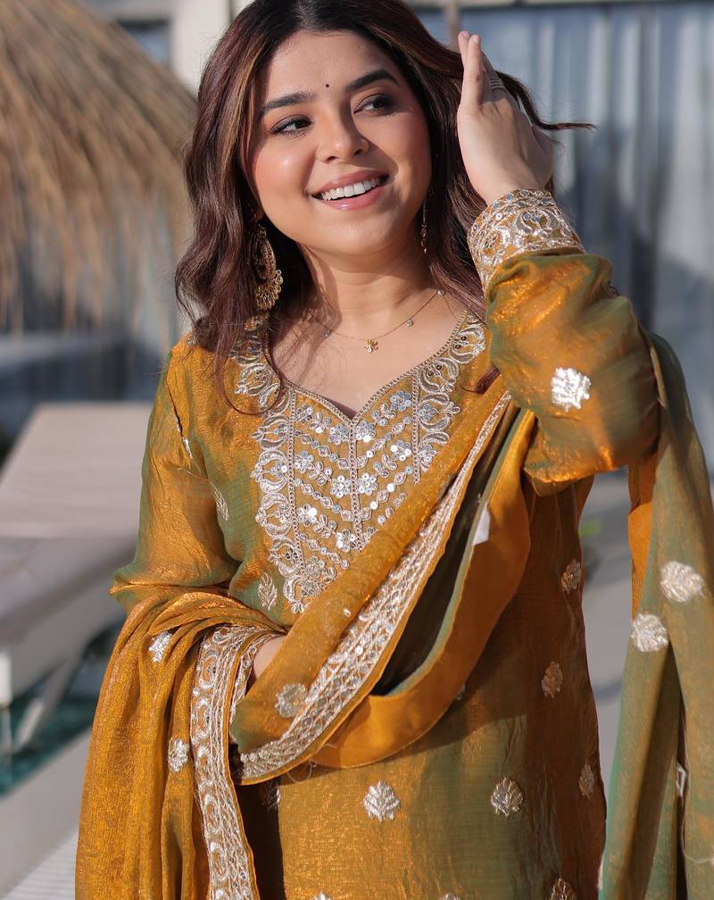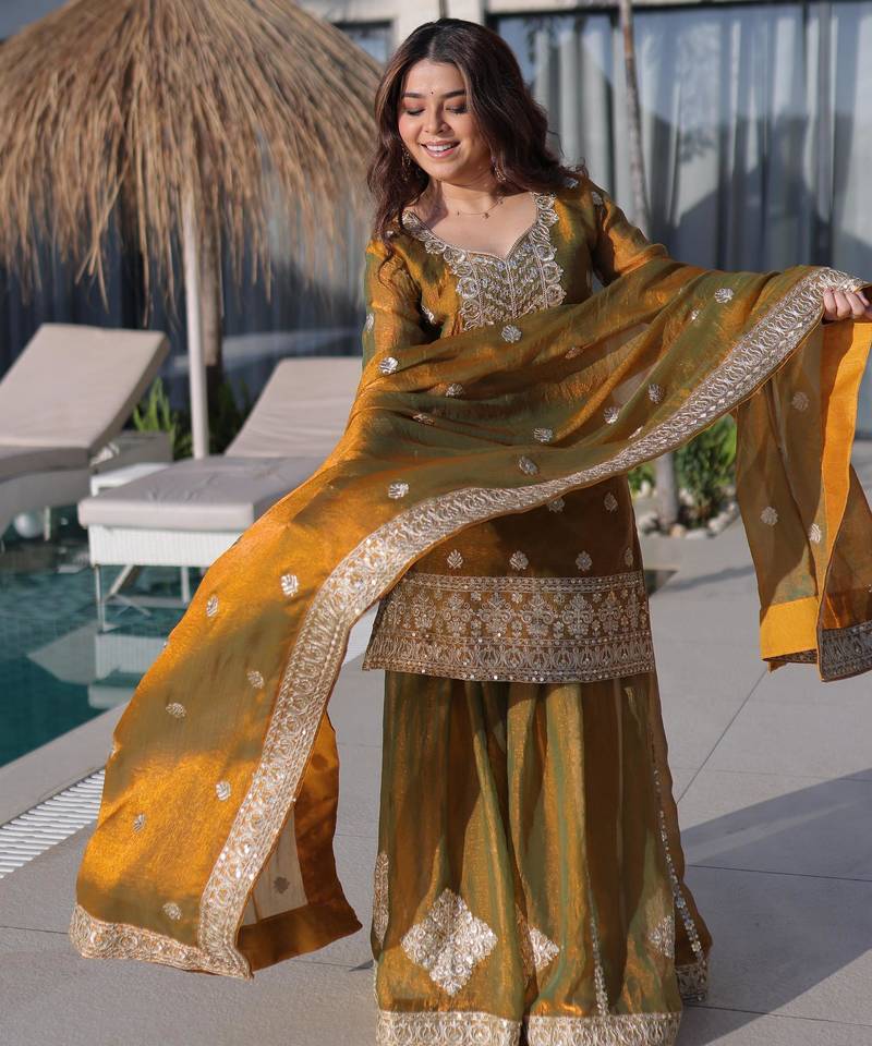 Mustard embroidered fendy chiffon designer sharara set with dupatta stitched