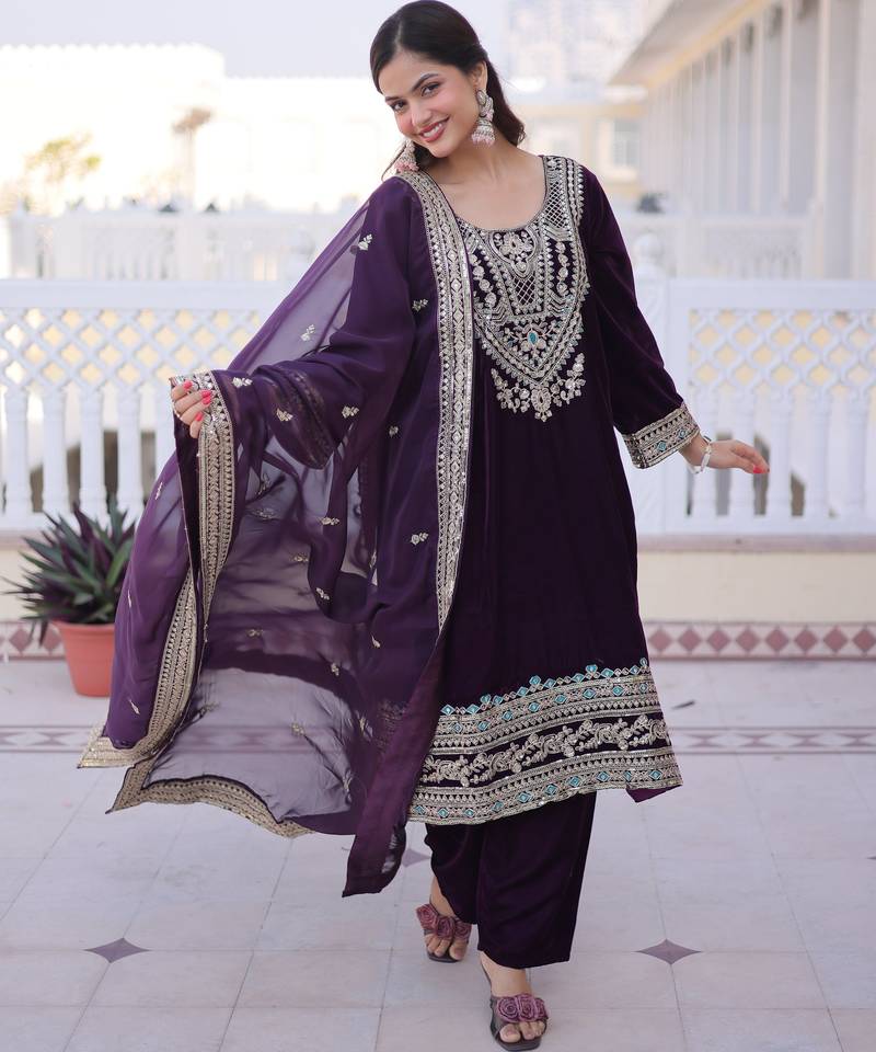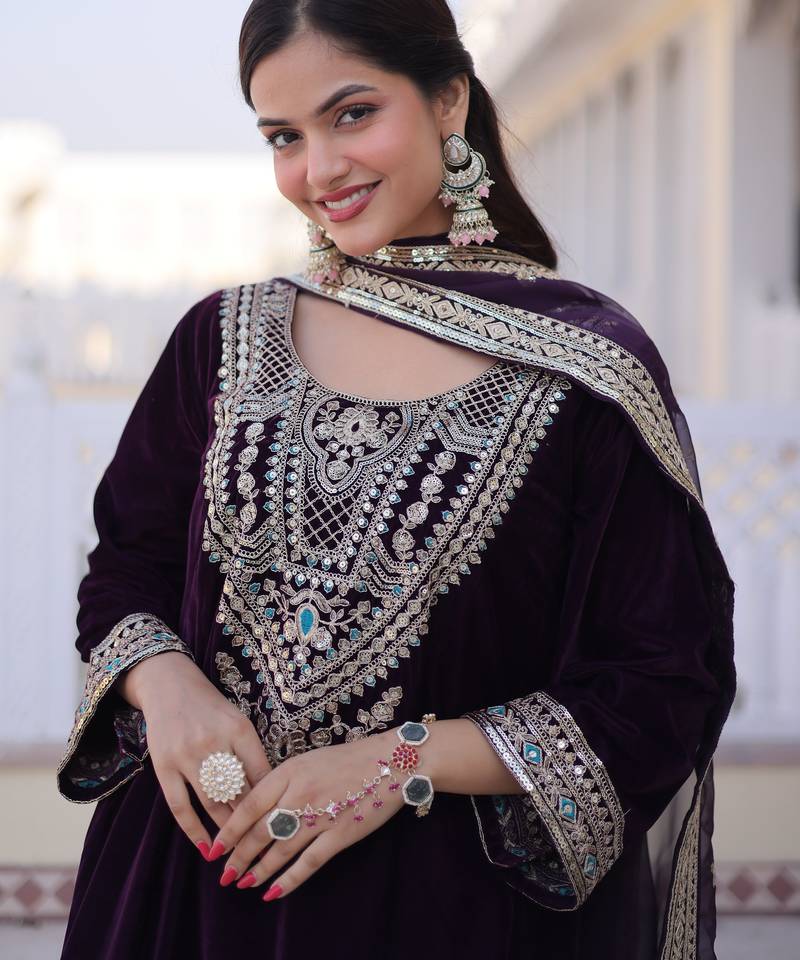 | Product Name | Wine Embroidered Velvet Designer Kurta Set With Dupatta | |