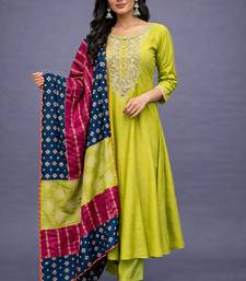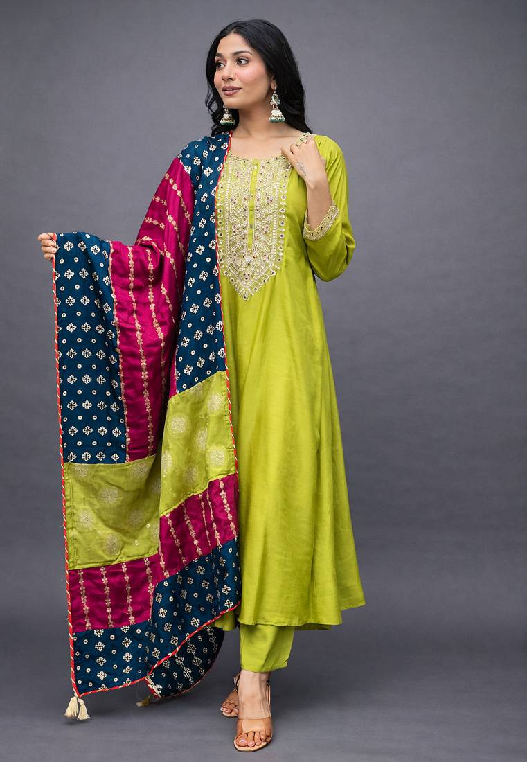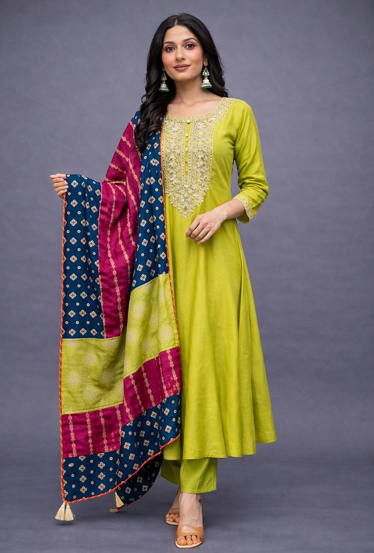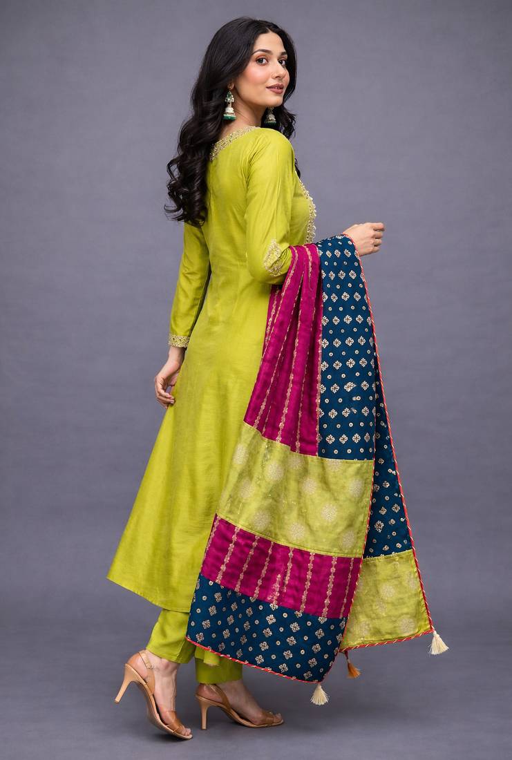 | Product Name | Elegant Lime Green Chanderi Kurta Set With Embroidered Neck And Contrast Dupatta Festive Wear | |