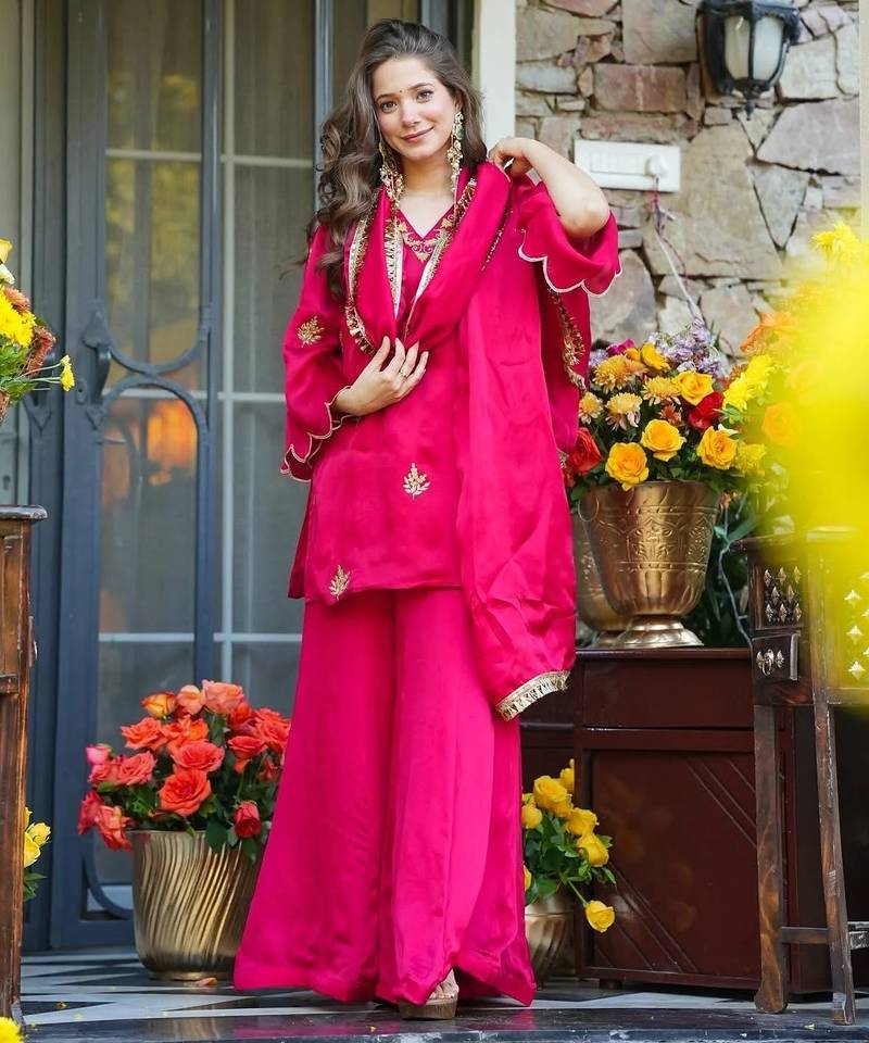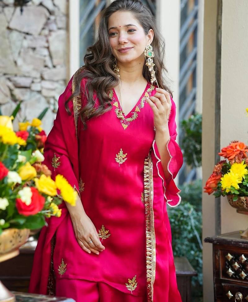 Stylish pink frendy silk kurta palazzo set with embroidery sequence work festive wear outfit