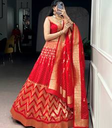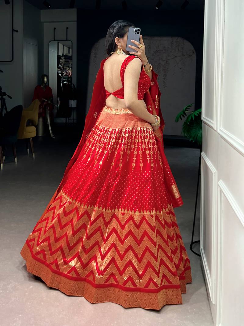 Bridal red banarasi style silk lehenga with traditional zari woven design