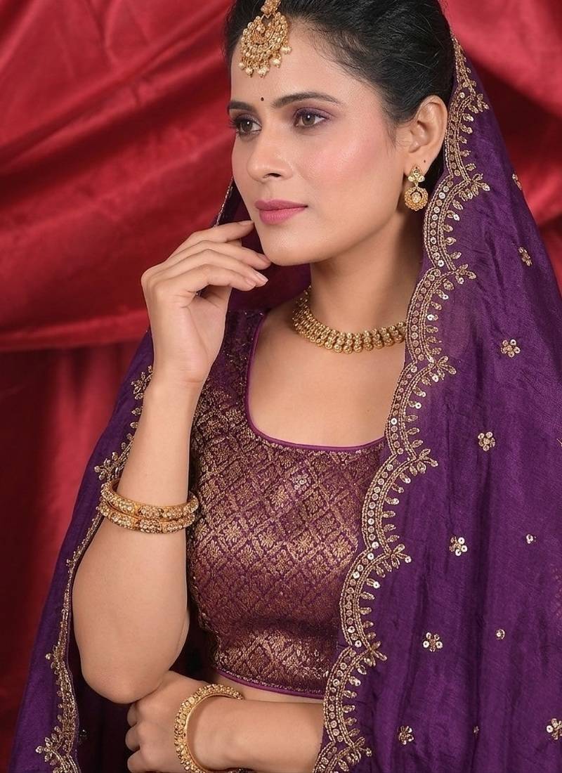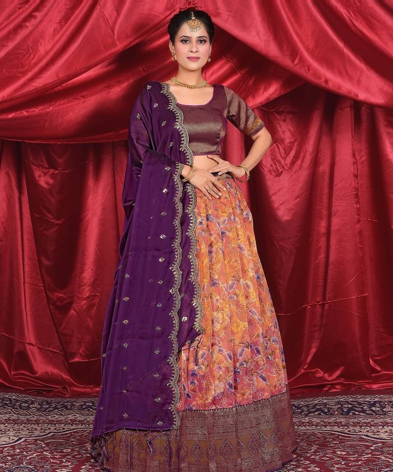| Product Name | Classic Peach & Plum Purple With Golden Floral Zari Tissue Lehenga | |