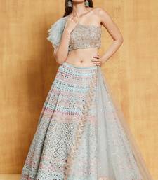 Sea green organza silk lehenga choli with multicolor thread, zari & mirror embroidery and net dupatta