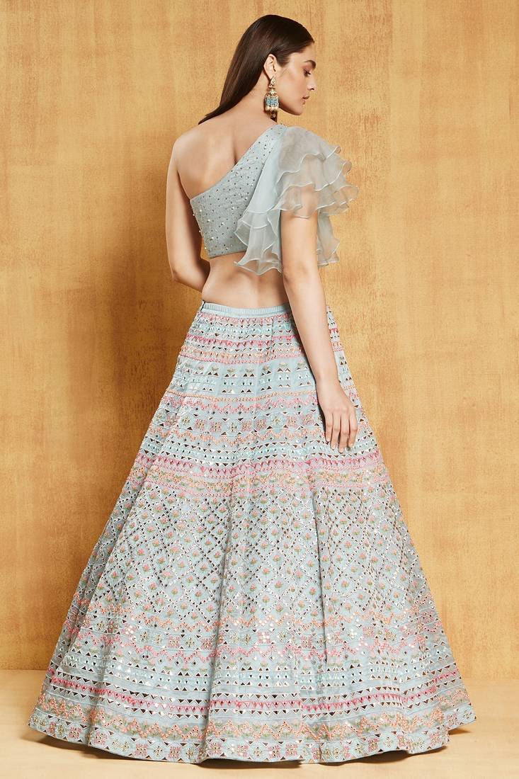 | Product Name | Sea Green Organza Silk Lehenga Choli With Multicolor Thread, Zari & Mirror Embroidery And Net Dupatta | |