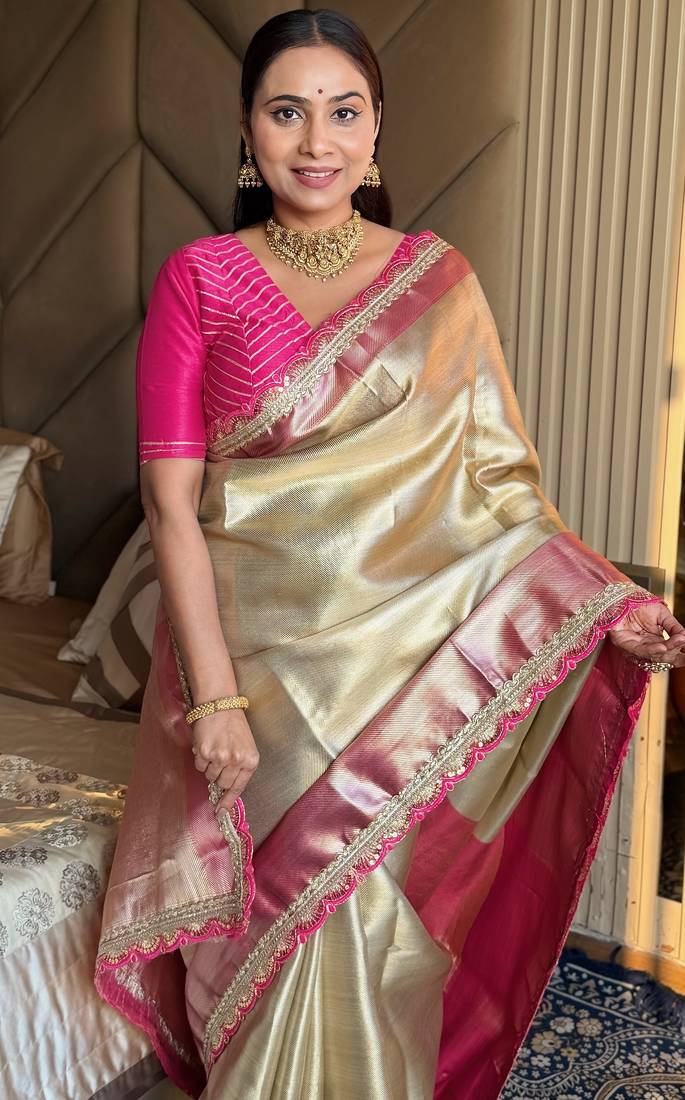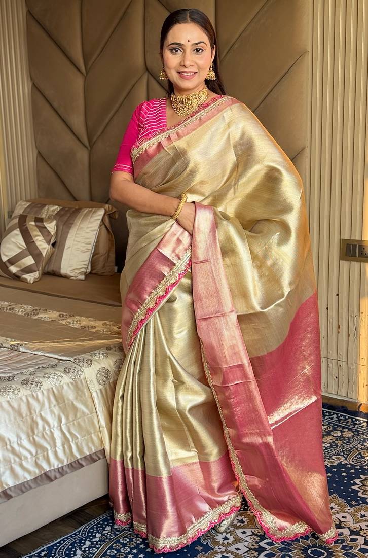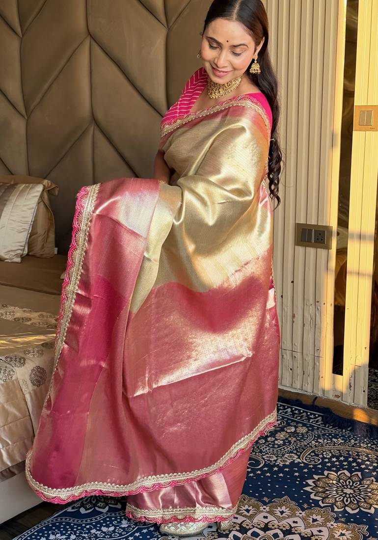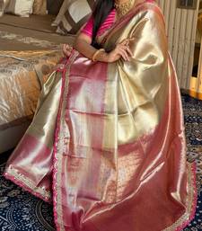 Beige silk banarasi saree with unstitched blouse piece