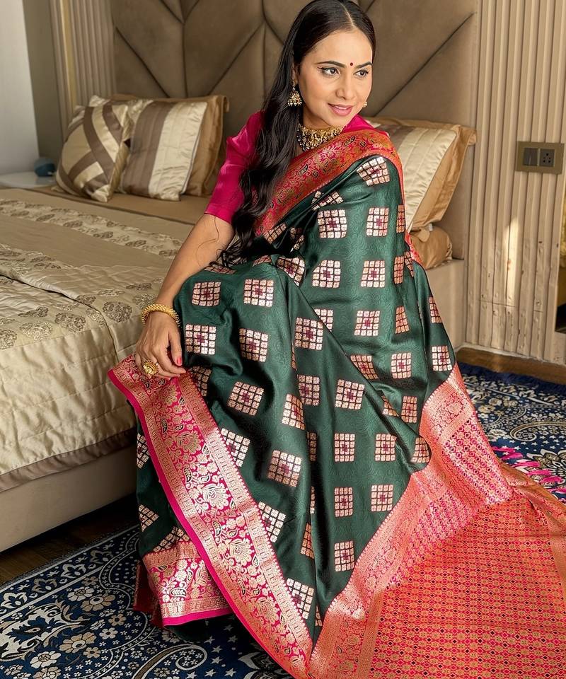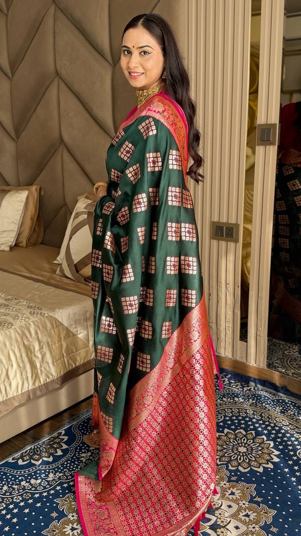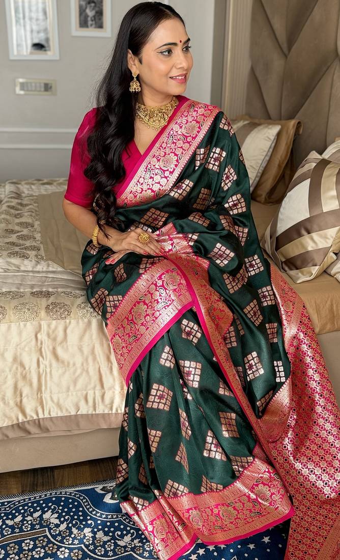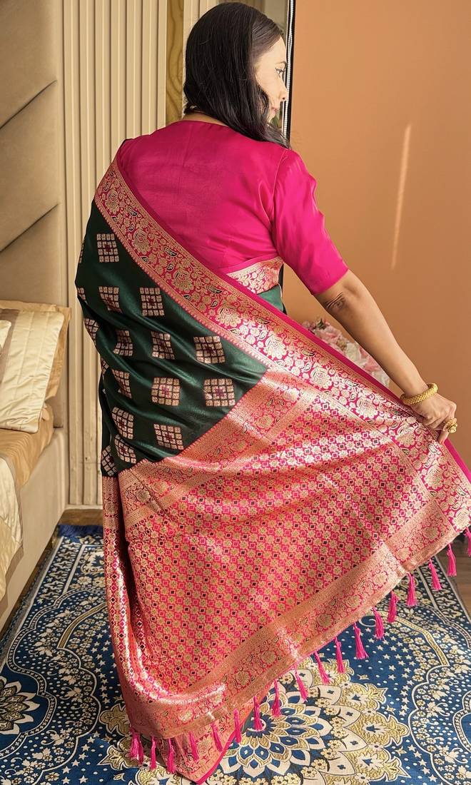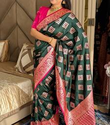 Dark green silk banarasi woven saree with unstitched blouse piece