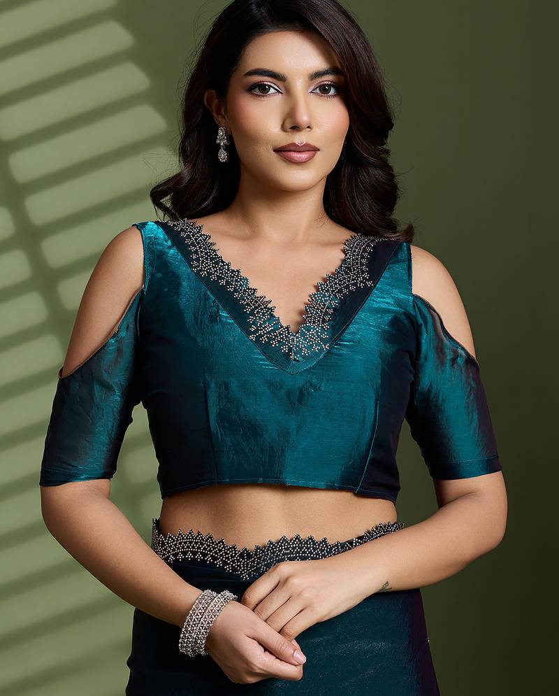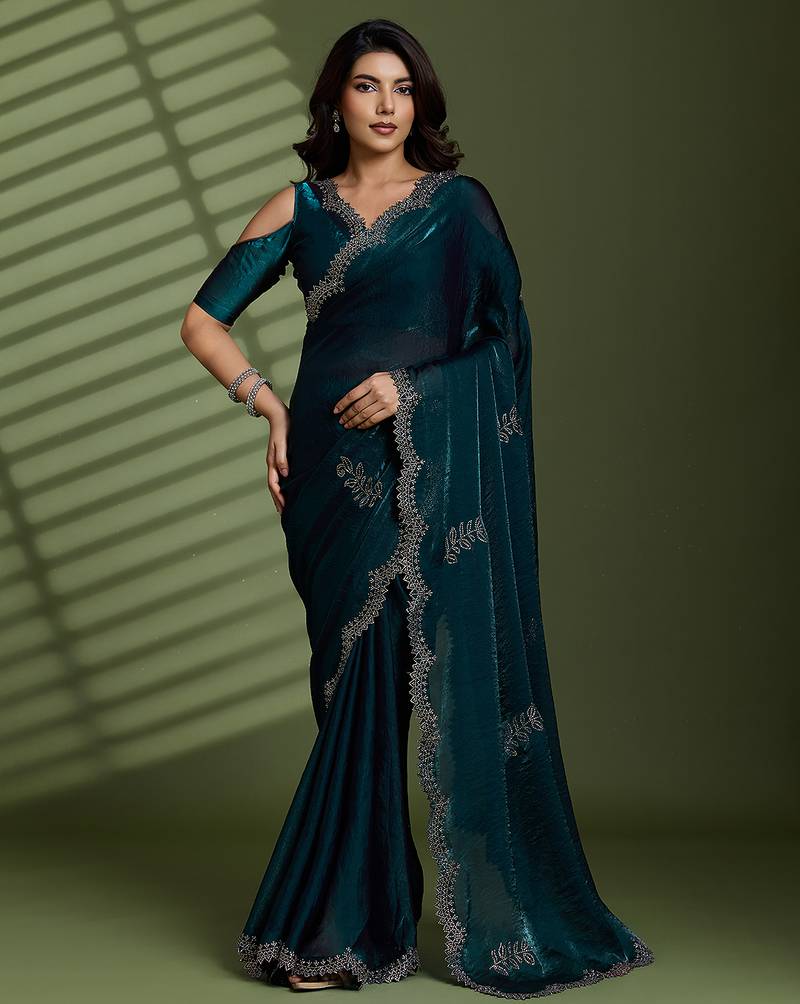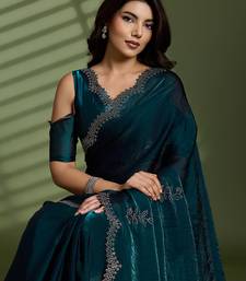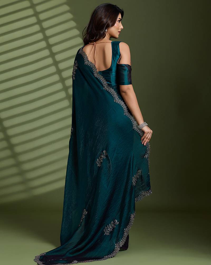 Dark green silk satin embellished saree with unstitched blouse piece