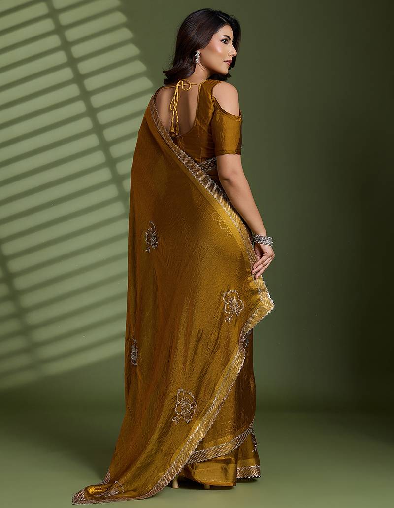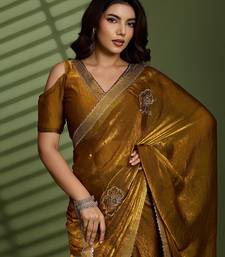 Gold silk satin embellished saree with unstitched blouse piece