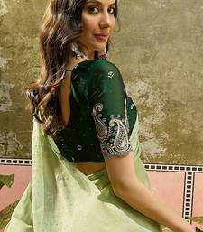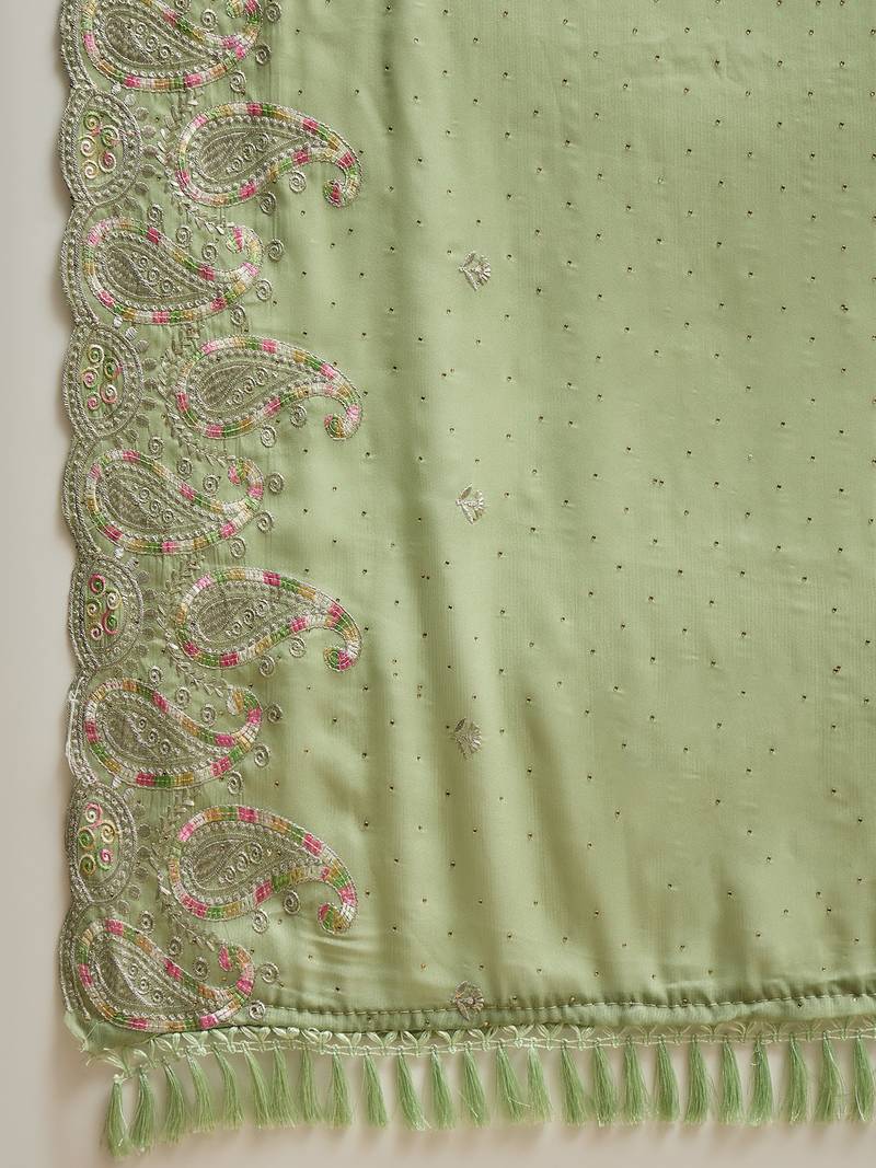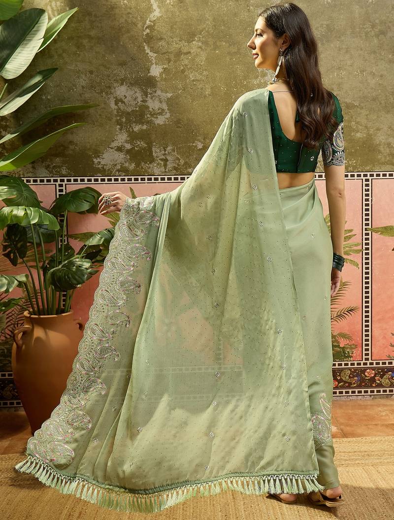 Green chiffon embroidered saree with unstitched blouse piece