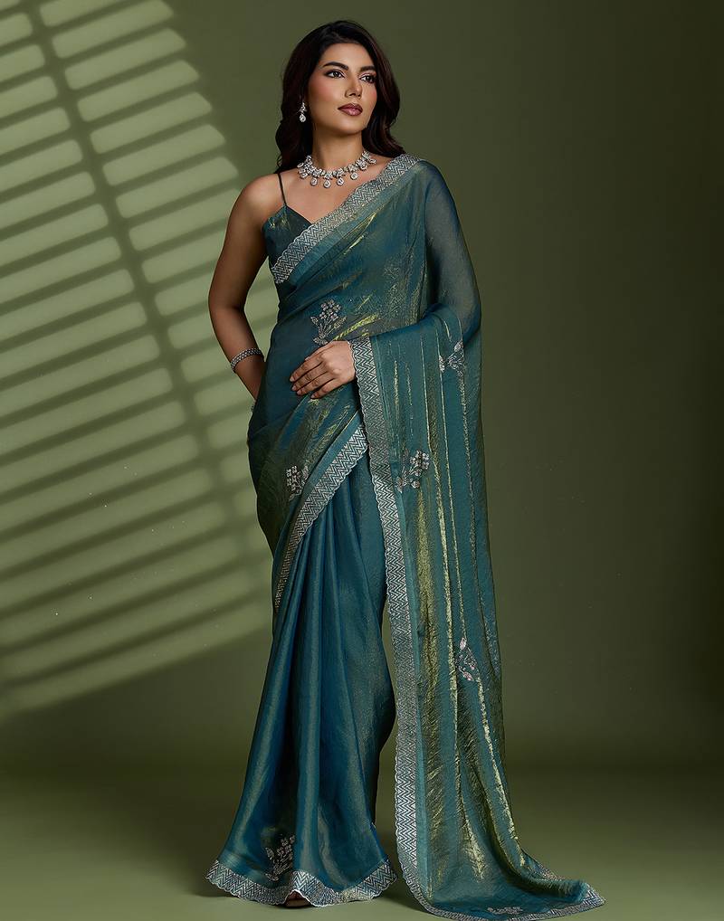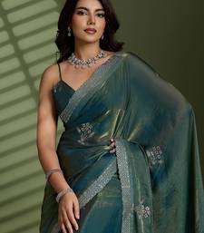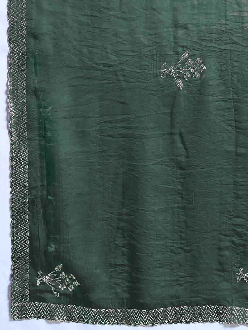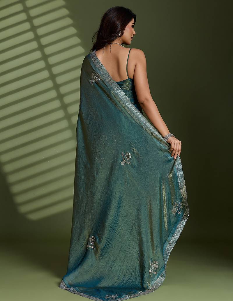 Green silk satin embellished saree with unstitched blouse piece