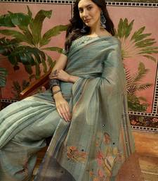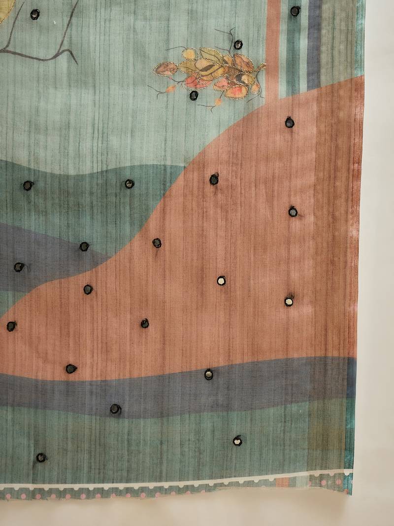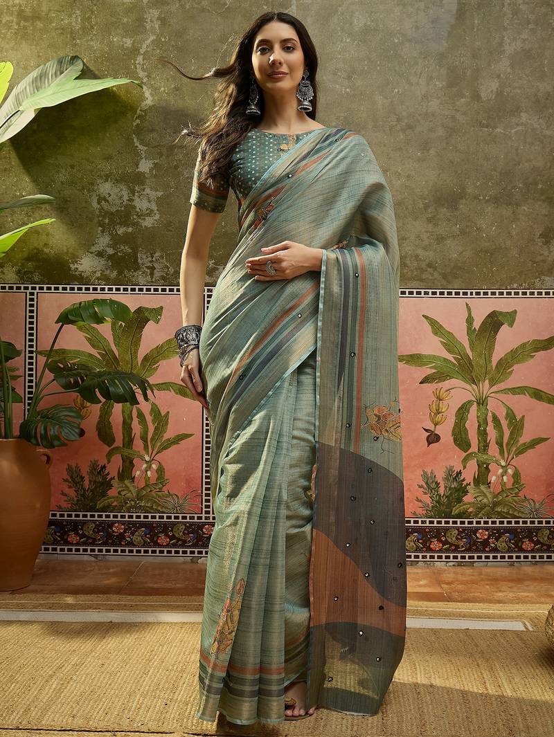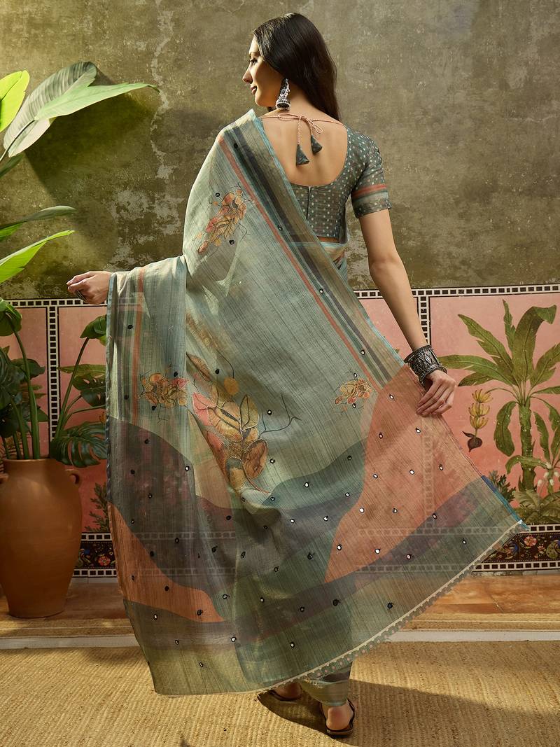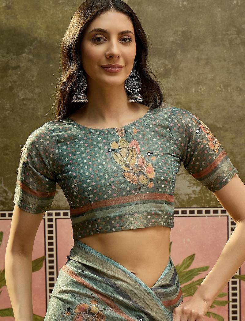 Gren cotton silk printed saree with unstitched blouse piece