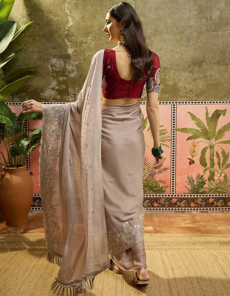 Grey chiffon embroidered saree with unstitched blouse piece