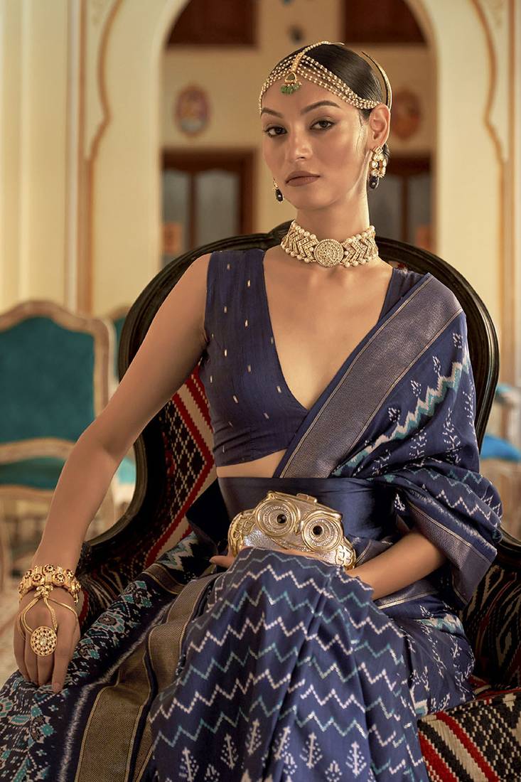Kimisha women's navy blue silk blend saree with unstitched blouse piece