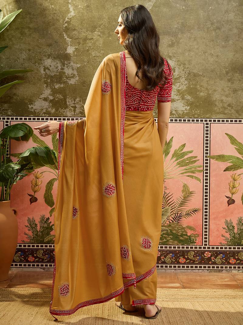 Mustard chiffon bandhni saree with unstitched blouse piece