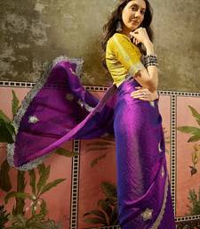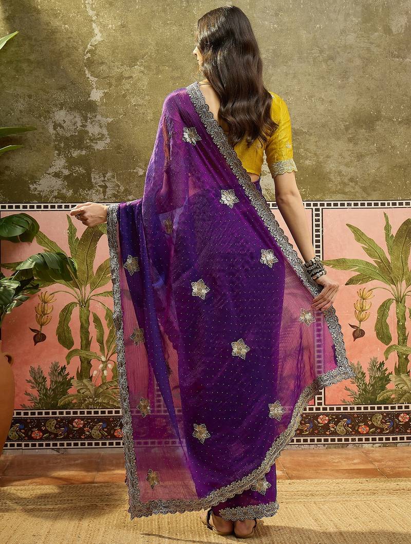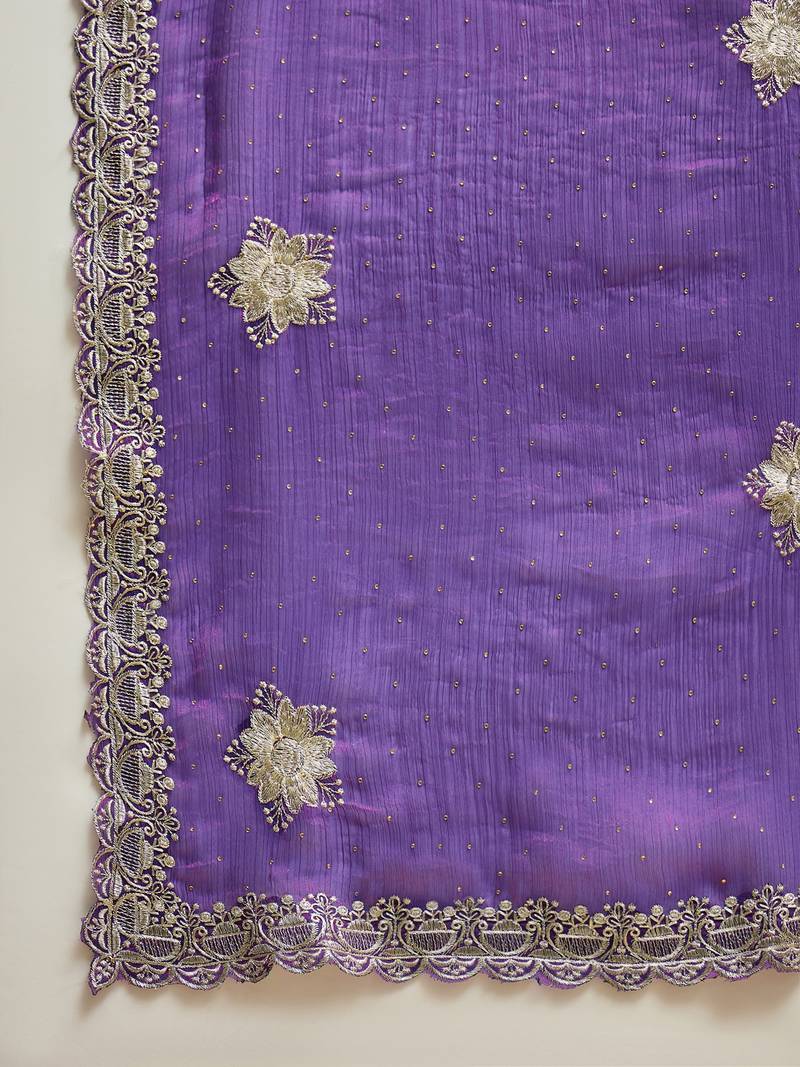 Purple silk chiffon embellished saree with unstitched blouse piece